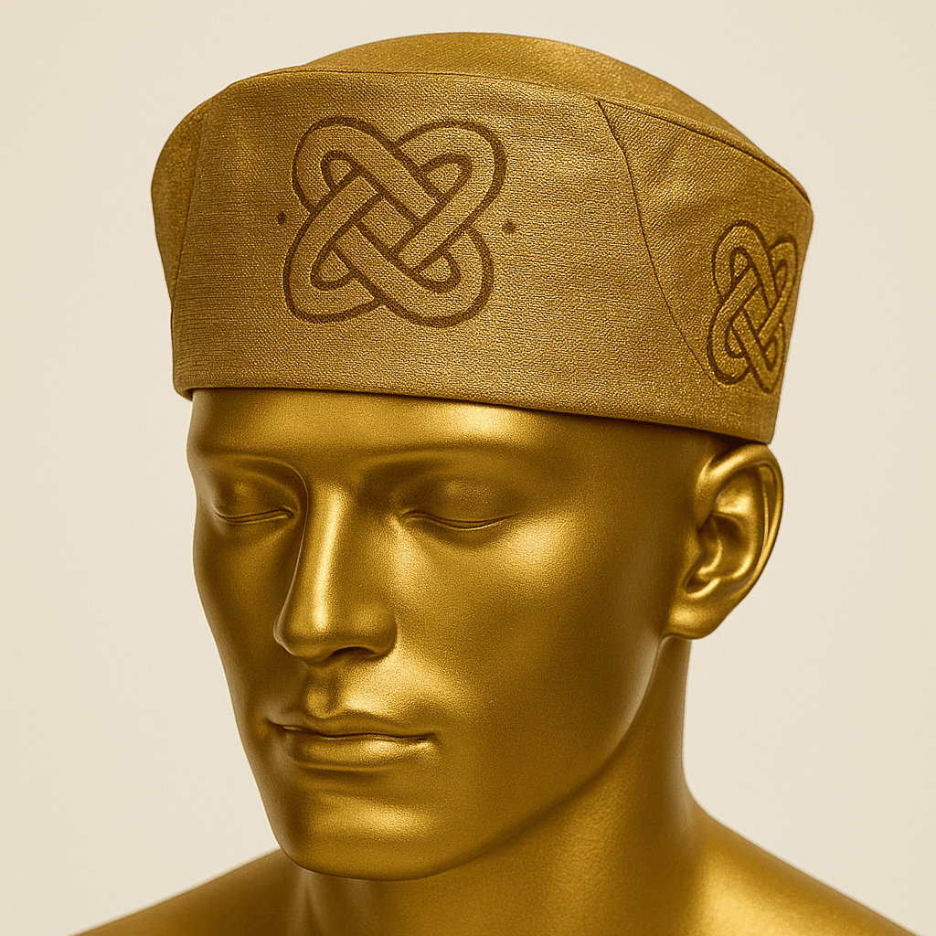Crown your traditional look with this exquisite golden Fila cap featuring intricate Celtic-inspired infinity knot embroidery. This premium handcrafted accessory represents the perfect fusion of cultural authenticity and symbolic artistry, designed for the gentleman who appreciates meaningful details and superior craftsmanship. This beautifully structured cap showcases rich golden fabric with raised embroidered infinity knot symbols on both the front and side panels. The interwoven Celtic knot pattern symbolizes eternity, unity, and interconnectedness, adding deep cultural meaning to the aesthetic beauty. The traditional Fila style construction maintains its elegant angular shape while providing comfortable all-day wear. Perfect for completing any traditional Nigerian outfit, this cap adds a distinguished finishing touch that speaks to heritage and sophistication. One size fits most with custom sizing available.