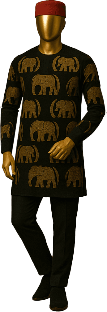 Distinctive long-sleeved senator featuring all-over golden elephant embroidery on rich fabric. Scattered elephant motifs create playful yet sophisticated pattern throughout the garment. Round neckline and flowing silhouette offer comfortable elegant styling. Paired with coordinating trousers and burgundy traditional cap for complete ensemble. Made from quality solid fabric with intricate golden threadwork creating each elephant design. The symbolic elephant imagery represents strength, wisdom, and prosperity. Rich golden embroidery against the base fabric creates luxurious texture and visual interest. Perfect for cultural celebrations, symbolic occasions, special ceremonies, fashion-forward events, or meaningful distinctive styling.