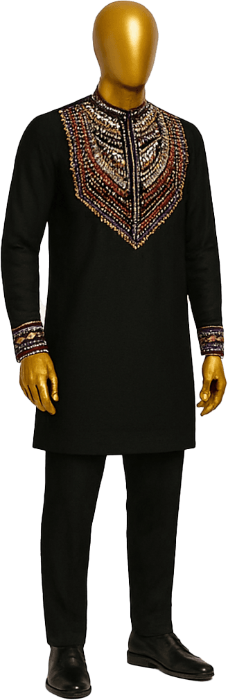 This sophisticated all-black long-sleeved tunic features spectacular multicolored beaded chest panel with chevron and geometric patterns in orange, red, white, and metallic tones. The intricate beadwork creates stunning focal point while matching beaded cuff details complete the coordinated look. Paired with black trousers for refined two-piece presentation. The elaborate beadwork demonstrates exceptional craftsmanship and attention to detail. The black base allows the colorful beading to take center stage. Perfect for high-profile celebrations where standout presentation matters.