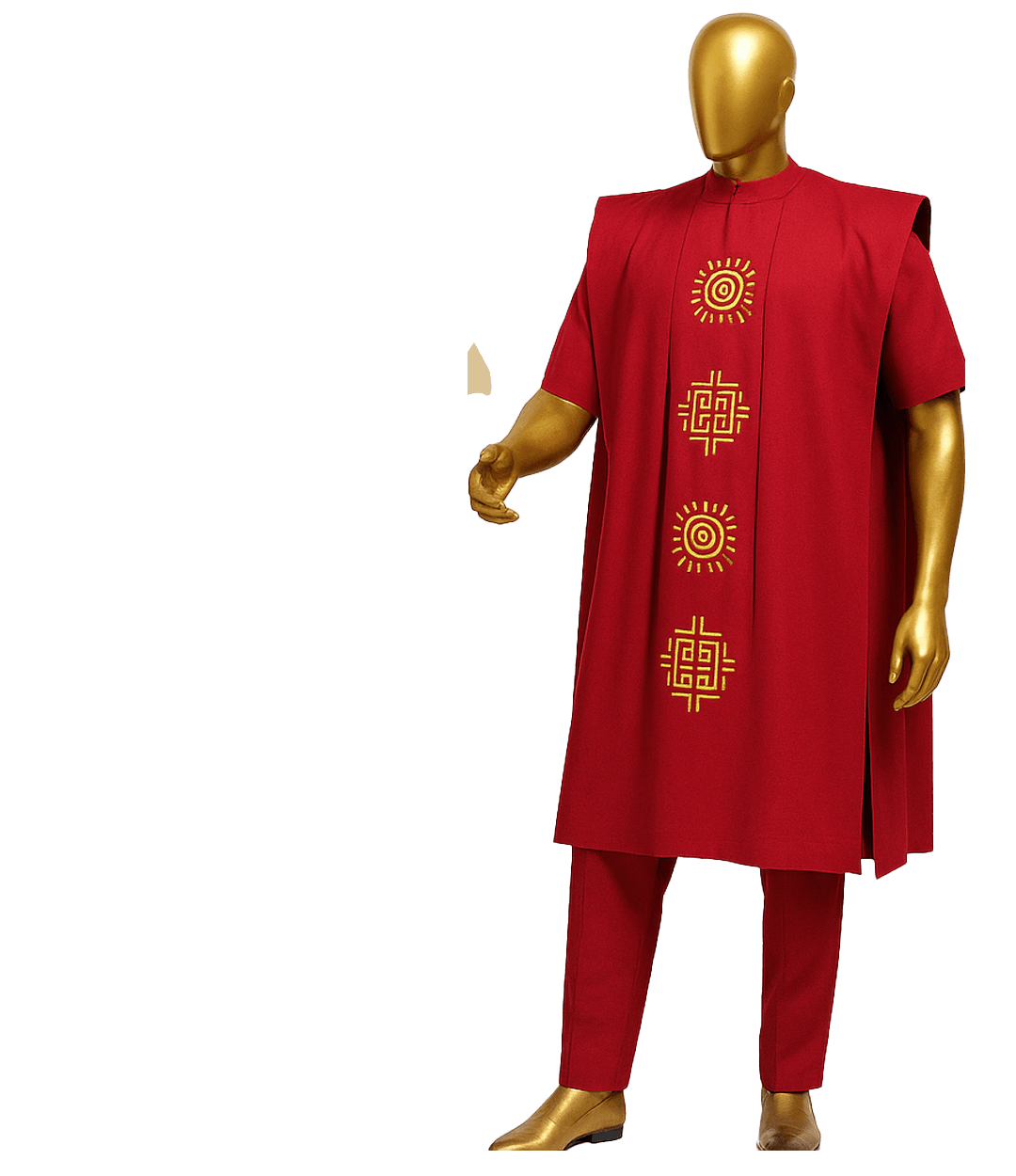 Make an unforgettable impression with this bold crimson red Senator ensemble adorned with stunning gold embroidery. This striking outfit is designed for the confident, charismatic gentleman who isn't afraid to stand out and celebrate his heritage with vibrant elegance. The ensemble features a short-sleeved Senator top in rich, deep red fabric, beautifully embellished with intricate gold embroidered traditional symbols running vertically down the center front. The golden sun and geometric motifs represent prosperity, strength, and cultural pride. The modern structured silhouette includes side splits for ease of movement and a sophisticated mandarin collar. Paired with matching red trousers, this complete look radiates power and prestige.