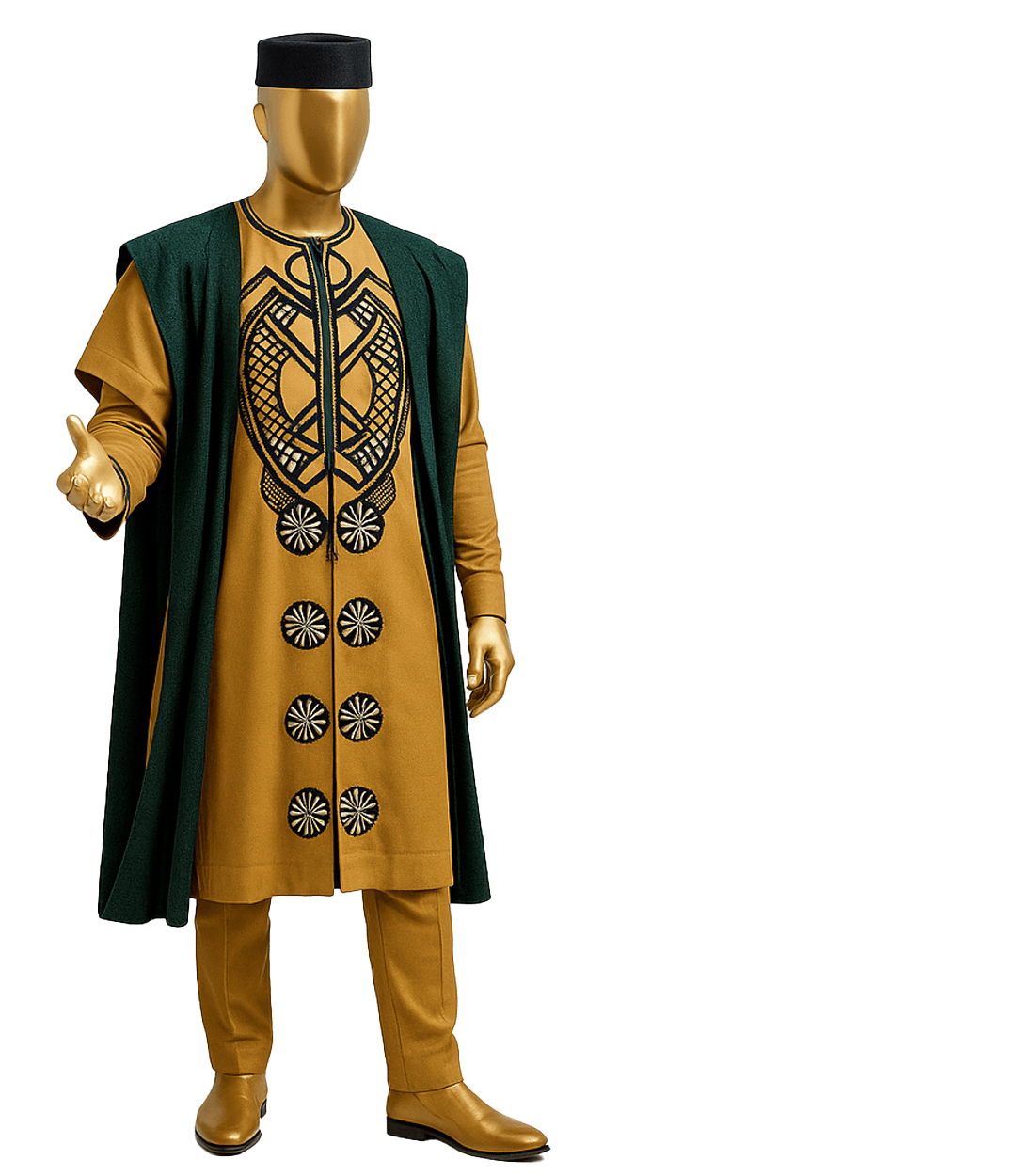 Make a bold, regal statement with this striking layered ensemble combining rich golden yellow with deep forest green. This luxurious four-piece set features dramatic color contrast and intricate embroidery, perfect for the gentleman who embraces bold color combinations and commanding presence. This spectacular outfit showcases a long-sleeved golden yellow Kaftan as the base layer, adorned with elaborate black geometric embroidery running vertically down the chest featuring lattice patterns and circular Adinkra symbols. Over this sits a sleeveless forest green outer Agbada that creates stunning color contrast and adds dramatic layering. The combination of warm gold and cool green creates visual depth and richness. Complete with matching golden yellow trousers and a coordinating black Kufi cap, this complete ensemble delivers powerful style for high-profile weddings, chieftaincy installations, cultural showcases, royal ceremonies, and prestigious gatherings where you want to make an unforgettable impression. The gold symbolizes prosperity while the green represents growth and vitality. Custom-tailored to your exact measurements for perfect layered fit.