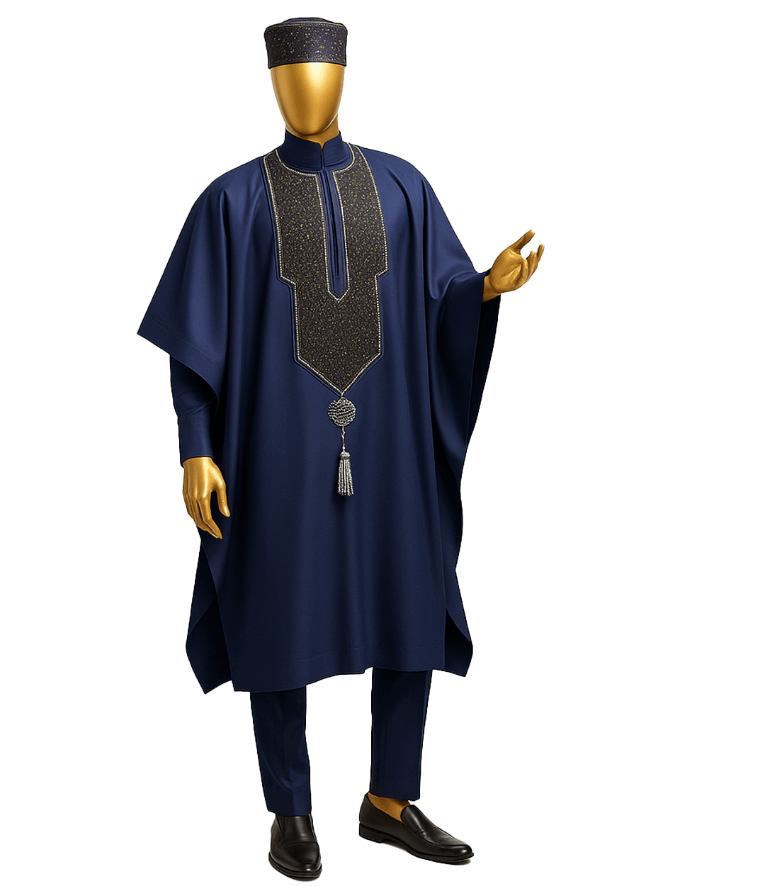 Experience sophisticated elegance with this stunning navy blue Agbada ensemble featuring a dramatic contrasting chest panel with intricate detailing. This luxurious four-piece set combines deep blue richness with textured embellishments and decorative elements, perfect for the gentleman who appreciates refined contrast and distinguished style. This impressive outfit showcases a short-sleeved Agbada in rich navy blue fabric, elevated by a striking charcoal gray embroidered chest panel that creates bold visual contrast. The elongated panel features intricate geometric embroidery and is finished with an elegant silver tassel pendant that adds movement and luxury. The traditional wide-sleeve design creates commanding presence and regal flow. The deep navy tone conveys authority, wisdom, and sophistication. Complete with matching navy trousers, inner top, and a coordinating black textured Kufi cap, this complete ensemble delivers powerful elegance for evening weddings, formal ceremonies, upscale cultural events, diplomatic gatherings, and prestigious occasions. The combination of navy blue with charcoal gray embroidered panel creates timeless sophistication that photographs beautifully. Custom-tailored to your exact measurements for impeccable fit and comfort.