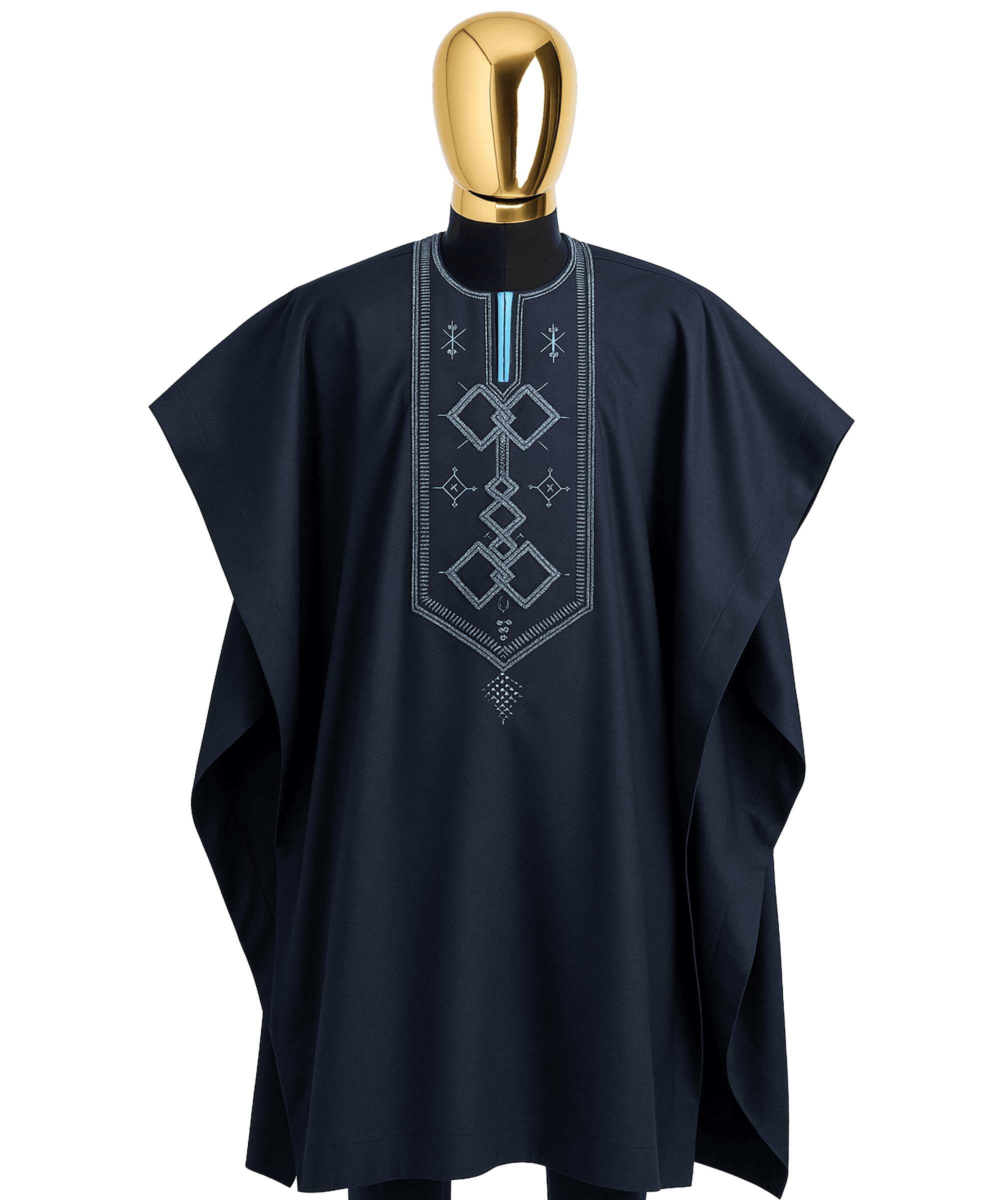 Command attention with this regal navy blue Agbada featuring stunning silver and sky-blue embroidery. This statement piece perfectly balances traditional craftsmanship with contemporary elegance, designed for the man who appreciates artistry and cultural pride. The flowing Agbada showcases an elaborate geometric embroidery pattern down the center front, featuring intricate diamond and cross motifs that symbolize heritage and nobility. The contrasting silver threadwork against the deep navy base creates a captivating visual effect, while the subtle turquoise accent adds a modern touch. The wide, dramatic sleeves and generous cut provide both comfort and an impressive silhouette.
