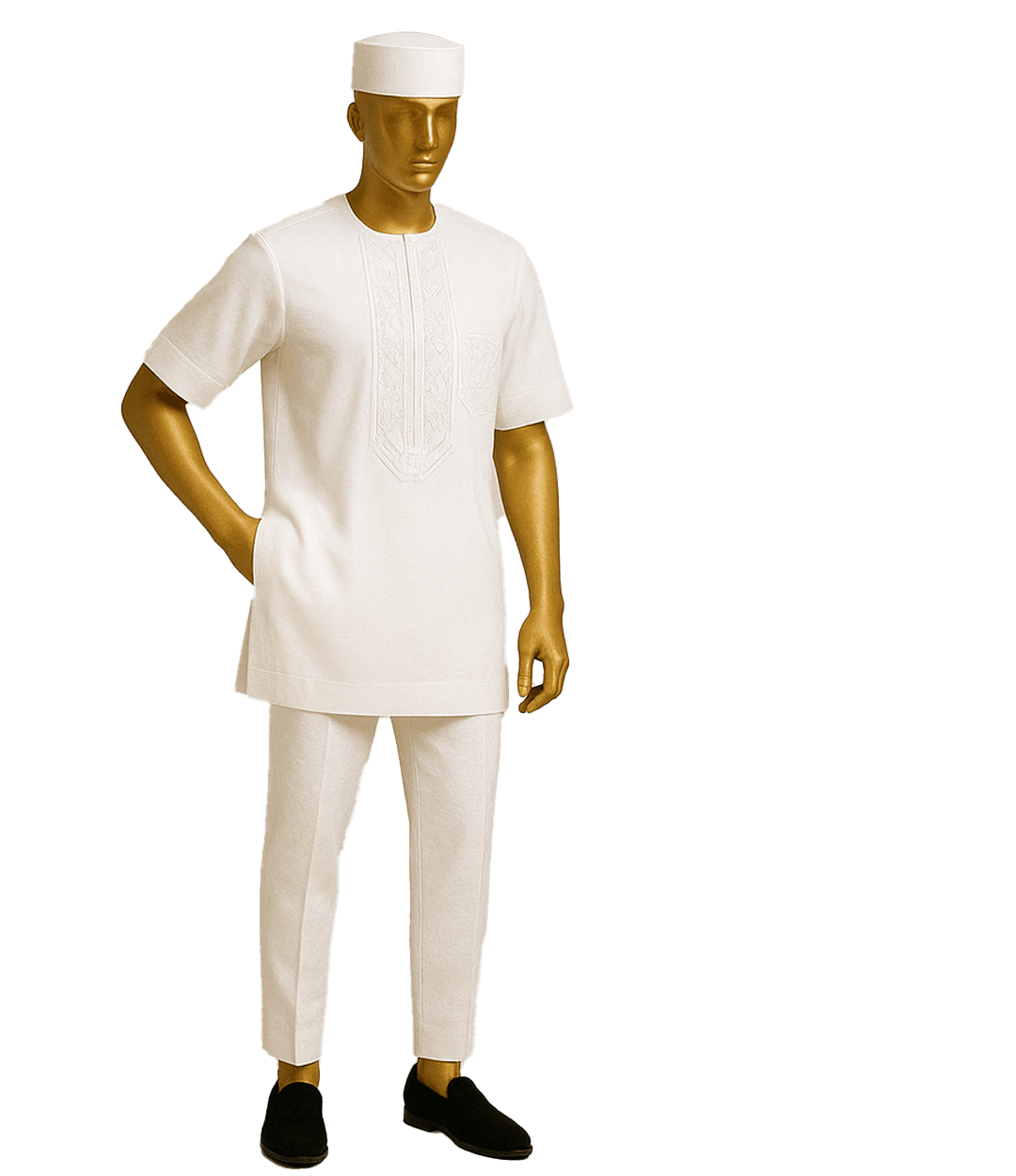 Embrace refined simplicity with this elegant ivory Senator ensemble that epitomizes timeless sophistication. This pristine off-white outfit offers versatile styling options and represents the perfect canvas for the modern gentleman who appreciates understated luxury and clean aesthetics. The outfit features a short-sleeved Senator top in soft ivory fabric, adorned with subtle tonal embroidery down the center front panel that adds texture without overwhelming the minimalist design. The contemporary round neckline and relaxed fit provide comfortable elegance for all-day wear. Paired with matching straight-leg trousers and completed with a coordinating ivory Kufi cap, this three-piece set delivers effortless polish.
