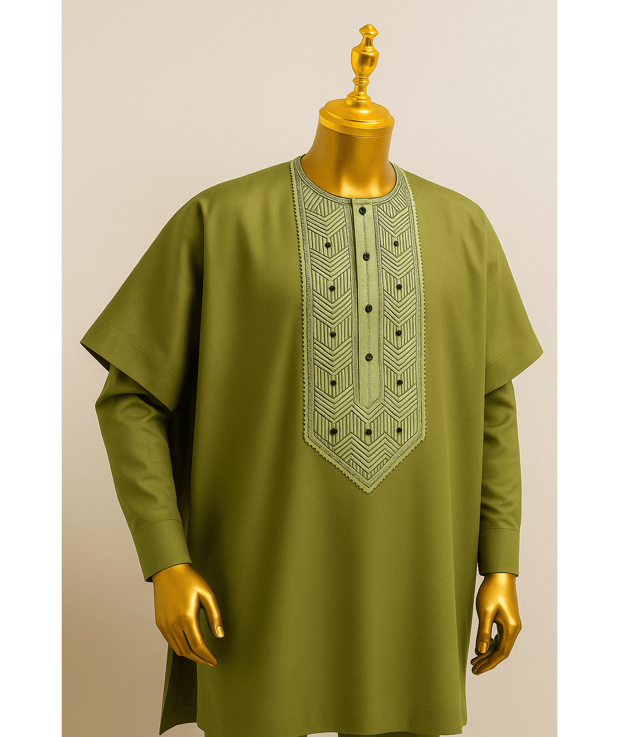 Distinctive olive green flowing agbada featuring elaborate cream geometric embroidery. The voluminous outer robe drapes elegantly with wide kimono-style sleeves. Stunning cream embroidered panel adorns the chest with chevron patterns, creating beautiful contrast against the sage-olive base. Fitted inner long-sleeved kaftan in coordinating green provides layered sophistication. The earthy olive tone offers unique alternative to traditional colors while maintaining elegance. Intricate embroidery showcases exceptional craftsmanship with geometric precision. Premium solid fabric ensures luxurious drape and movement. Perfect for outdoor celebrations, cultural events, garden weddings, distinguished gatherings, or showcasing distinctive style with traditional sophistication.