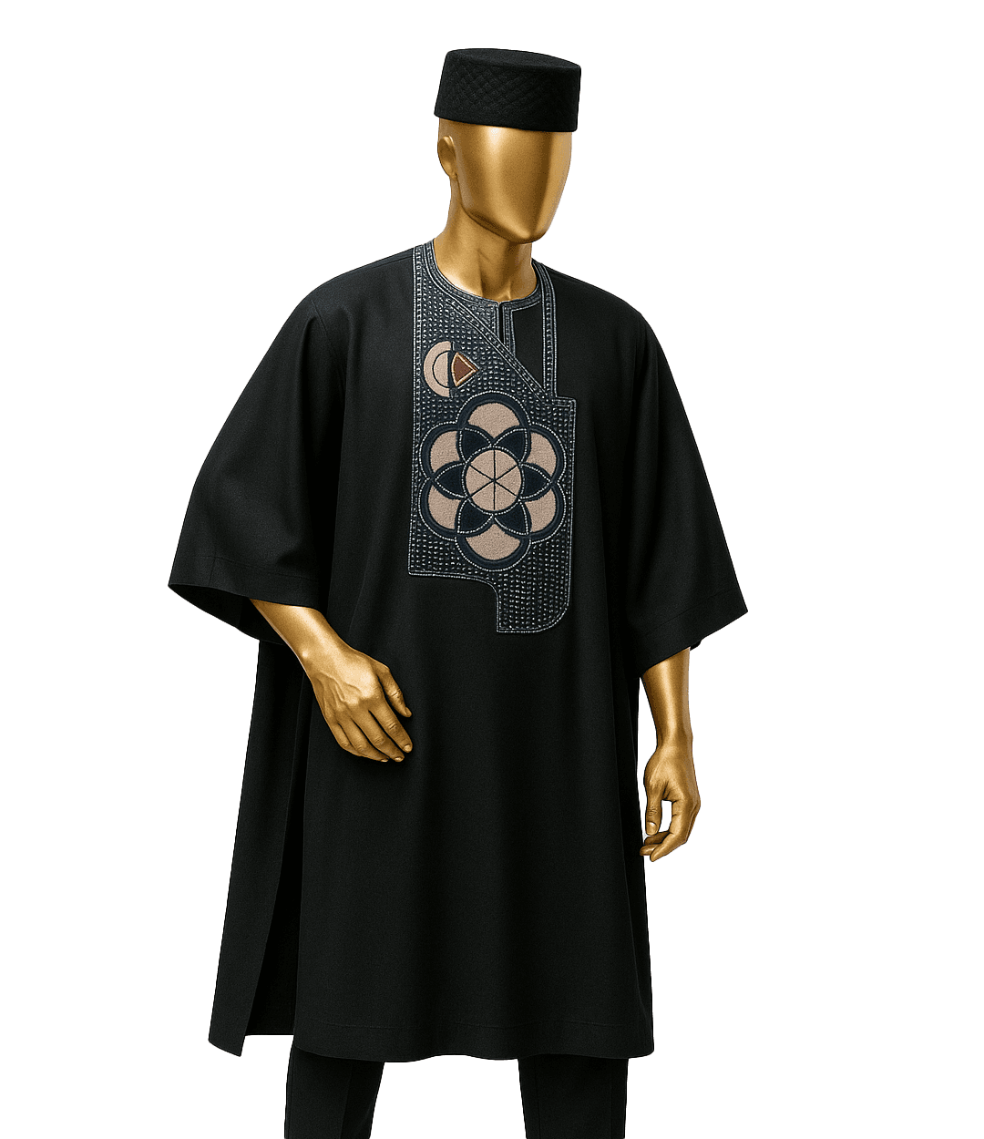 Command powerful presence with this striking all-black Agbada featuring stunning cream and rust geometric embroidery in a sacred geometry pattern. This luxurious three-piece set combines monochromatic elegance with symbolic detailing, perfect for the gentleman who appreciates spiritual symbolism and sophisticated contrast. This impressive outfit showcases a short-sleeved Agbada in premium black fabric, elevated by eye-catching embroidered panel featuring the Seed of Life sacred geometry pattern with crescent moon accent in cream and rust tones against a textured background. The ornate design creates powerful focal point. The traditional wide-sleeve design creates dramatic flow. Complete with matching black trousers and a coordinating black Kufi cap, this three-piece ensemble delivers commanding style for black-tie weddings, formal evening ceremonies, spiritual gatherings, and occasions requiring distinguished presence. Custom-tailored to your exact measurements.