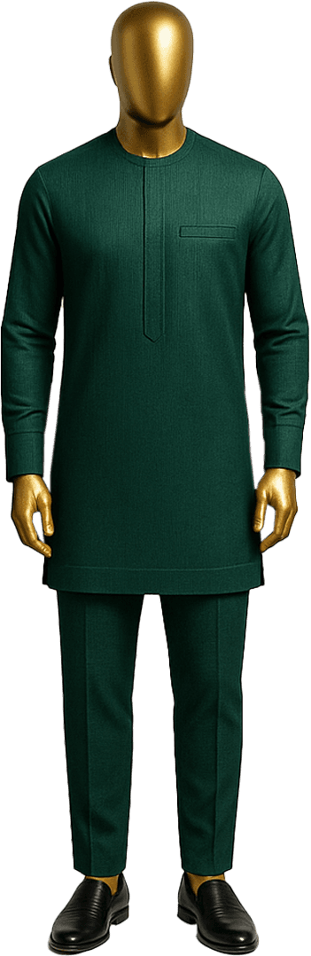 Sleek forest green long-sleeved senator set in premium solid fabric. Clean, minimalist design featuring subtle center seam detailing and chest pocket accent. The fitted long-sleeved top offers contemporary styling with traditional roots. Round neckline and tailored silhouette create modern, polished appearance. Paired with matching forest green trousers for complete tonal coordination. Made from quality solid fabric with smooth, luxurious finish. The rich jewel-tone green exudes confidence and sophistication. Simple, understated design allows the premium fabric and bold color to shine. Ideal for business events, cultural gatherings, religious services, upscale occasions, or everyday distinguished wear.