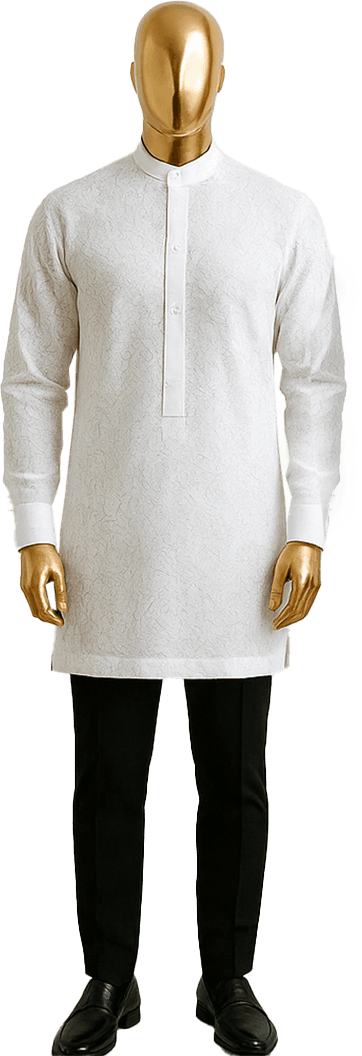 Pure white long-sleeved tunic in textured fabric with clean vertical placket and mandarin collar. The subtle texture in the white fabric creates visual interest without patterns or embroidery. Simple, elegant, timeless. Pair with black trousers for classic contrast or white trousers for monochromatic sophistication. Sometimes less really is more. This piece proves that exceptional fabric and perfect tailoring create impact without embellishment. Ideal for intimate ceremonies, religious occasions, or anywhere understated elegance matters most. Easy to accessorize with caps and beads in any color.