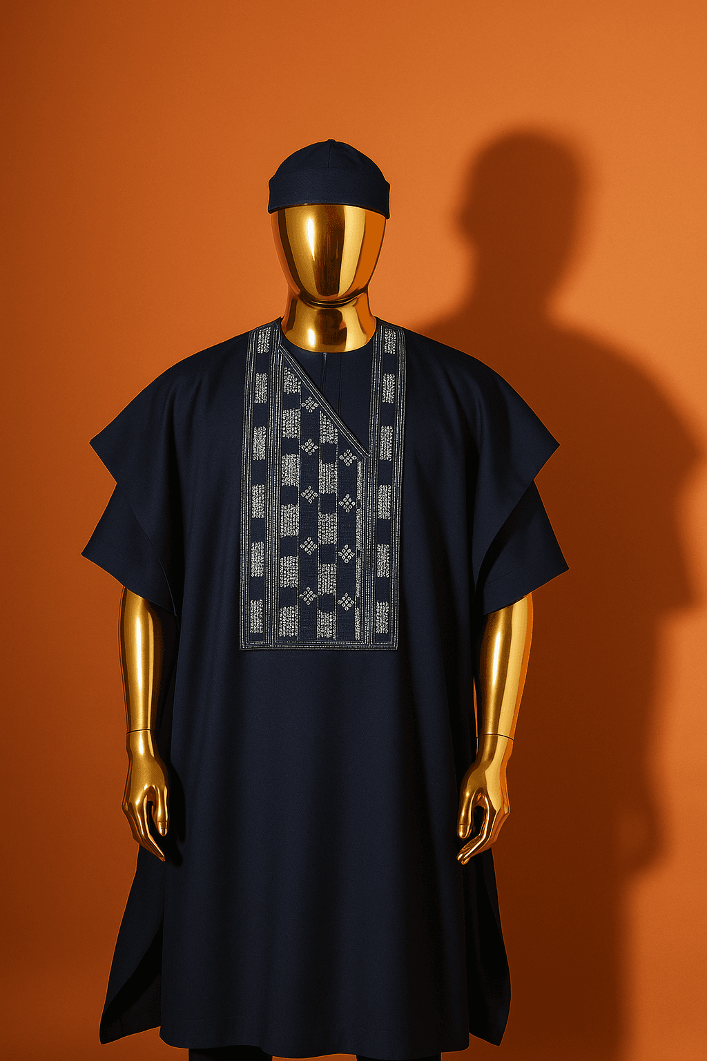 Deep navy blue flowing Agbada with subtle lapel detail and clean lines throughout. The short-sleeved outer robe drapes dramatically while maintaining refined sophistication. Minimal embellishment allows the luxurious navy fabric to take center stage. Complete with red cap for striking contrast and matching navy trousers. The lapel detail adds contemporary tailoring element to traditional silhouette. Navy offers timeless versatility—equally appropriate for evening galas or daytime celebrations. The flowing cut provides comfort and presence without fussy details. Add coral beads for traditional styling or keep accessories minimal for modern interpretation.