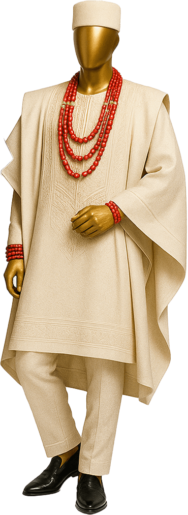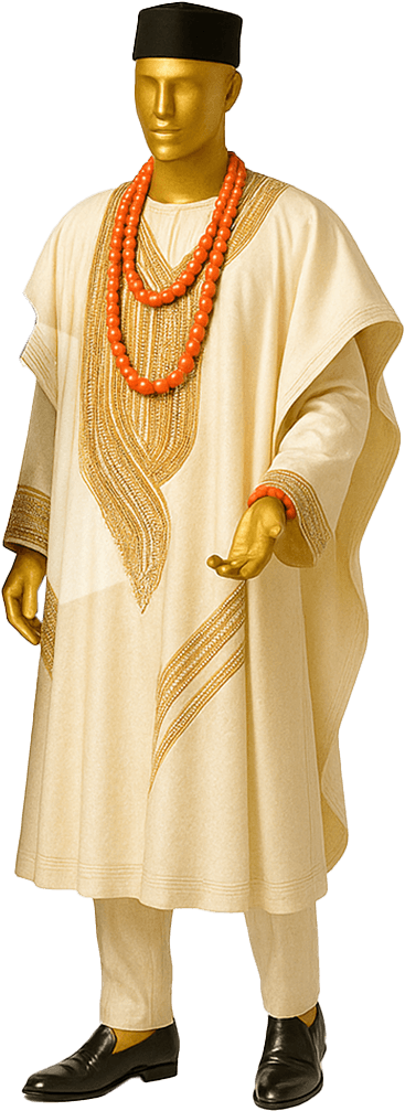 Elegant cream flowing agbada with stunning golden embroidered cascading design. The graceful outer robe features intricate swirling golden threadwork flowing diagonally across the body and down the sleeves. Wide kimono-style sleeves create dramatic movement and luxurious drape. Fitted inner long-sleeved kaftan in coordinating cream with beautiful golden embellishment at cuffs. Matching cream trousers complete the refined ensemble. Styled with multiple strands of traditional coral beads and classic cap. Made from premium solid fabric with exceptional embroidery craftsmanship. The warm cream base with metallic golden accents creates timeless sophistication. Perfect for traditional weddings, milestone celebrations, cultural festivals, or distinguished gatherings.