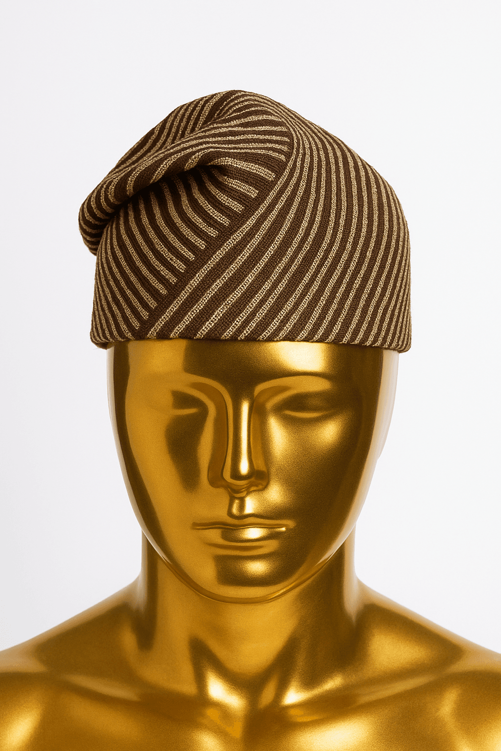 Complete your traditional look with this sophisticated brown Aso-Oke cap featuring elegant diagonal striping and distinctive wrapped styling. This premium handwoven accessory represents authentic Nigerian craftsmanship with a fashion-forward twist, perfect for the gentleman who appreciates textured elegance and cultural authenticity. This beautifully crafted cap showcases authentic Aso-Oke fabric in rich brown and gold tones with dramatic diagonal striping woven throughout, creating dynamic visual movement and dimensional texture. The traditional Gele-style wrap construction adds height and distinctive shape, making this stand out from standard Kufi styles. The diagonal pattern creates a slimming, elongating effect while the brown and gold palette conveys warmth, stability, and prosperity. The structured wrap maintains impressive shape throughout wear. Perfect for weddings, cultural celebrations, formal ceremonies, and occasions requiring distinctive traditional accessories. This unique style bridges classic Yoruba tradition with contemporary fashion sensibility. One size with adjustable wrap construction for secure, comfortable fit.