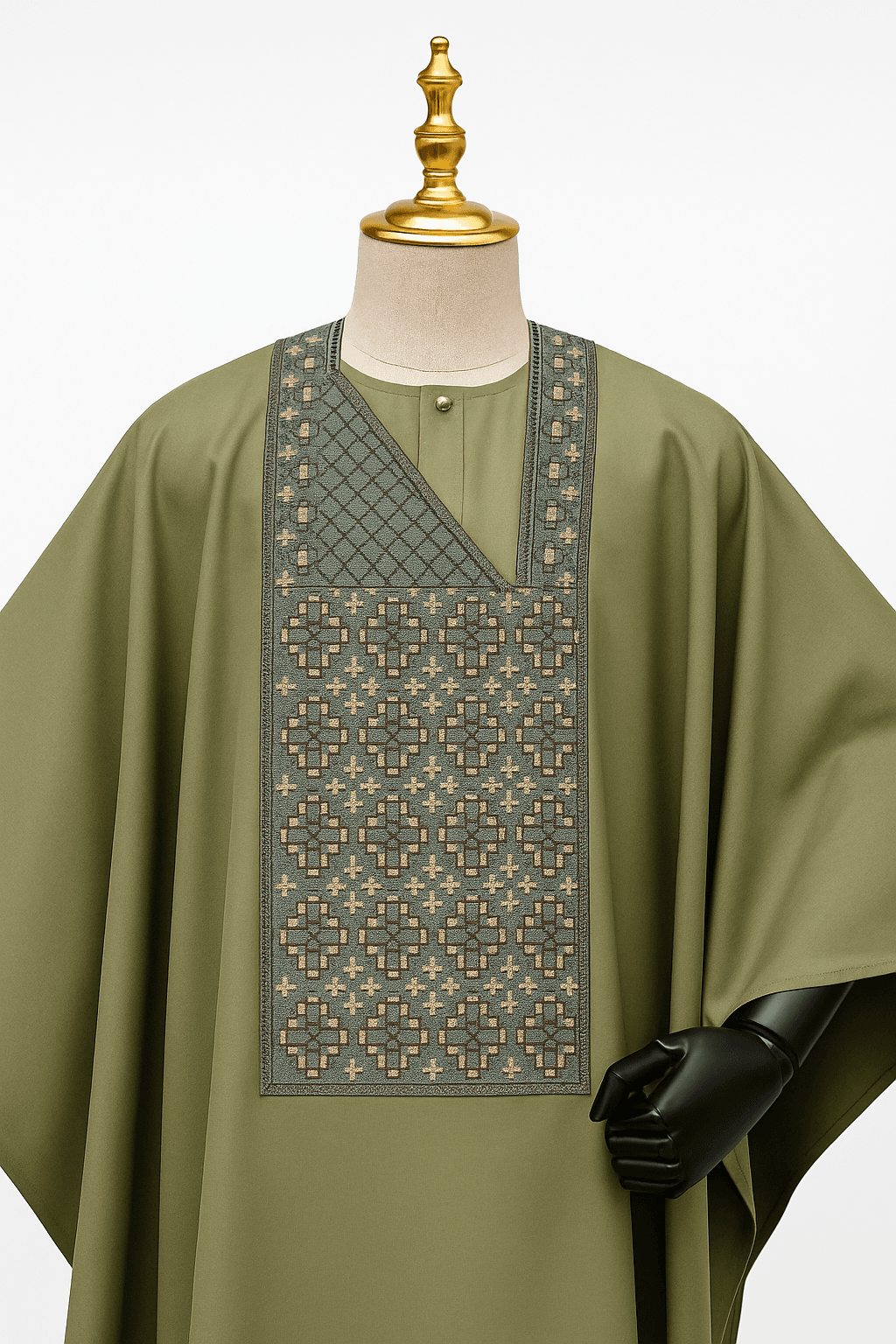 This sophisticated olive green short-sleeved Agbada showcases an elaborate embroidered chest panel featuring basketweave patterns in tan and grey tones. The asymmetric embroidery design creates visual interest with geometric precision. The muted olive base allows the detailed needlework to take center stage. The flowing outer robe offers dramatic presence while maintaining comfort. The earth-toned embroidery provides dimension without bold color contrast, creating subtle elegance. Pair with matching olive trousers for a complete look that works across formal and semi-formal occasions.