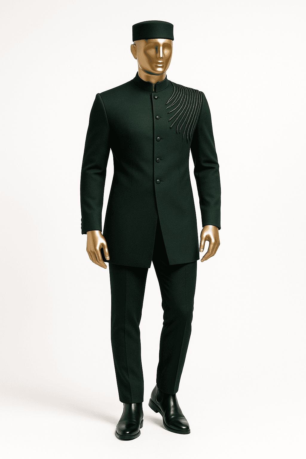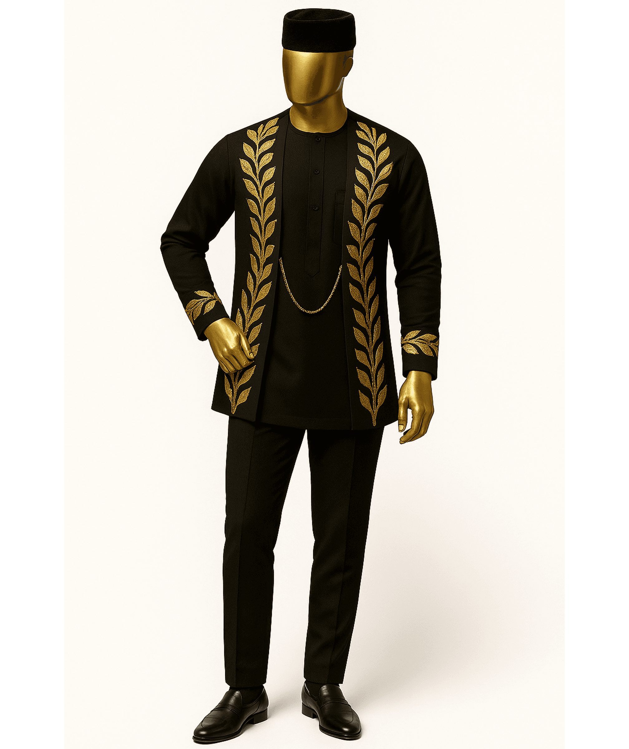 Embody triumph and excellence in this distinguished black Senator suit adorned with striking golden leaf embroidery cascading down the front and sleeves. Complete with matching cap, this fitted ensemble balances traditional symbolism with modern tailoring. The intricate detailing represents growth, prosperity, and achievement—perfect for the accomplished man celebrating life's victories at graduations, promotions, and prestigious ceremonies.