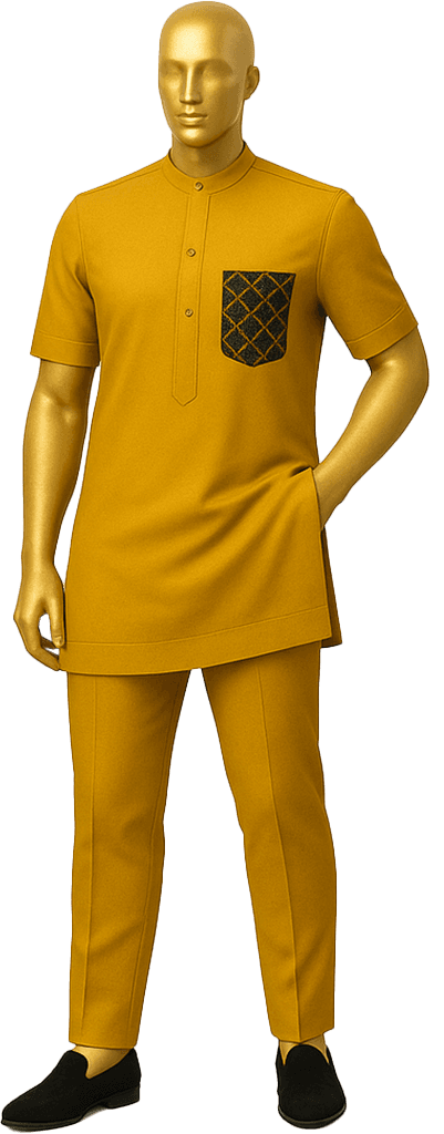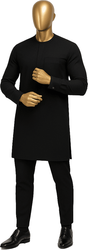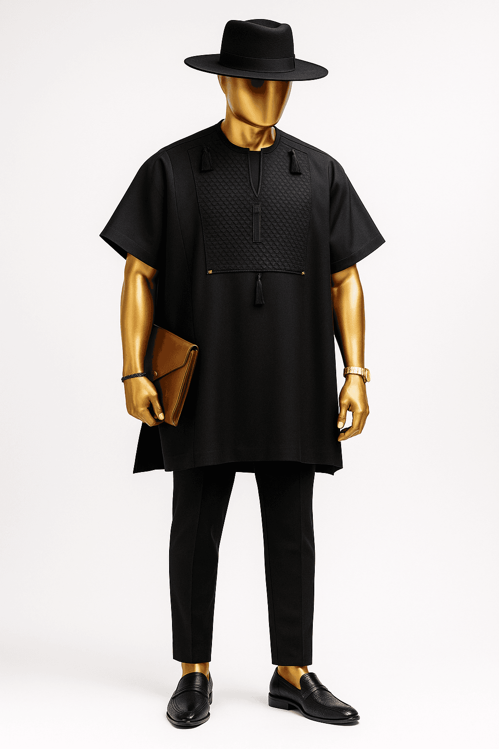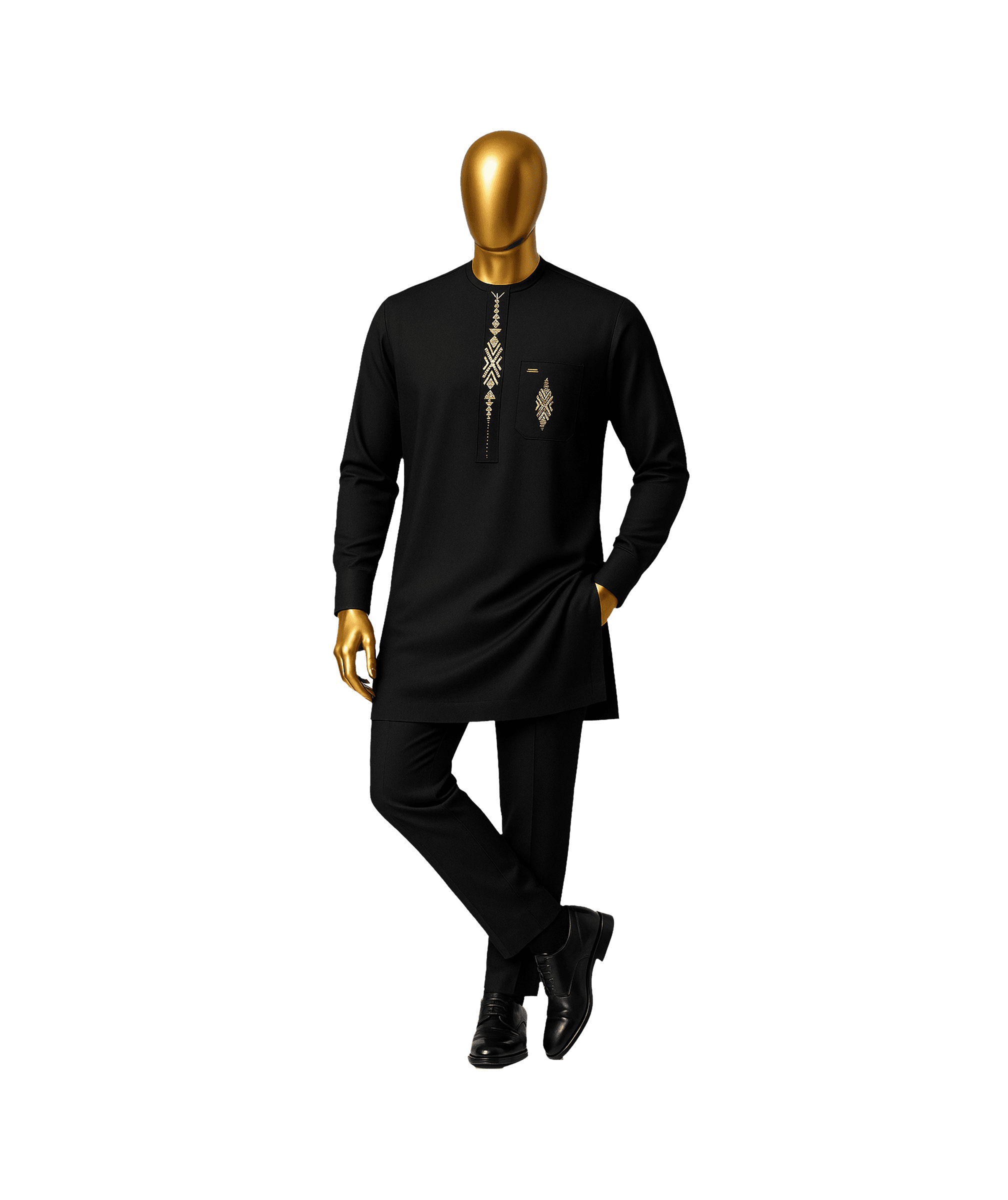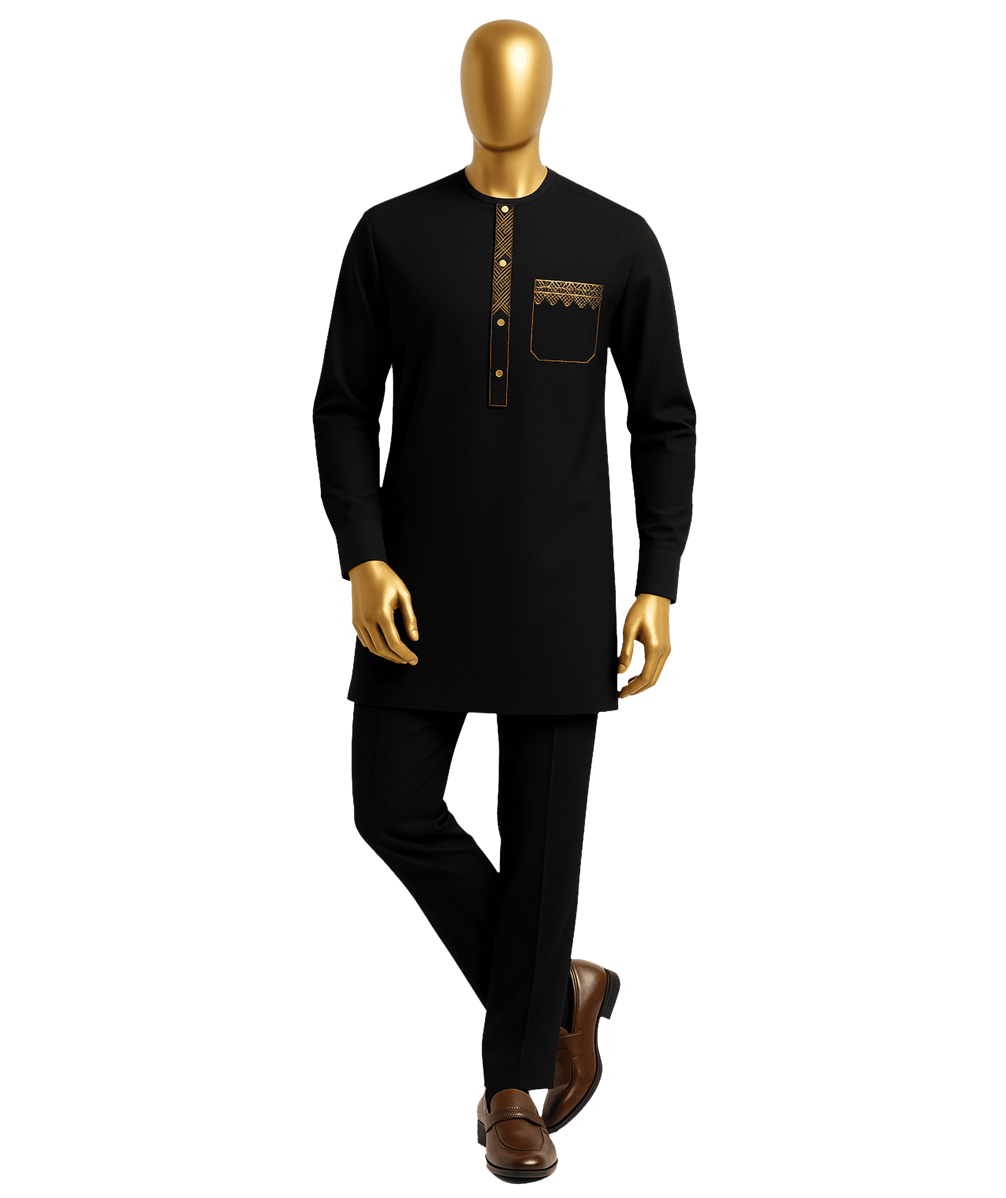 Step into understated power with this all-black ensemble that redefines minimalist sophistication. The long-sleeved tunic showcases a golden embroidered pocket accent that adds subtle luxury without overwhelming the clean lines. Paired with matching black trousers, this set speaks to the modern Nigerian man who understands that true elegance whispers rather than shouts. Ideal for evening events, gallery openings, and upscale gatherings.
