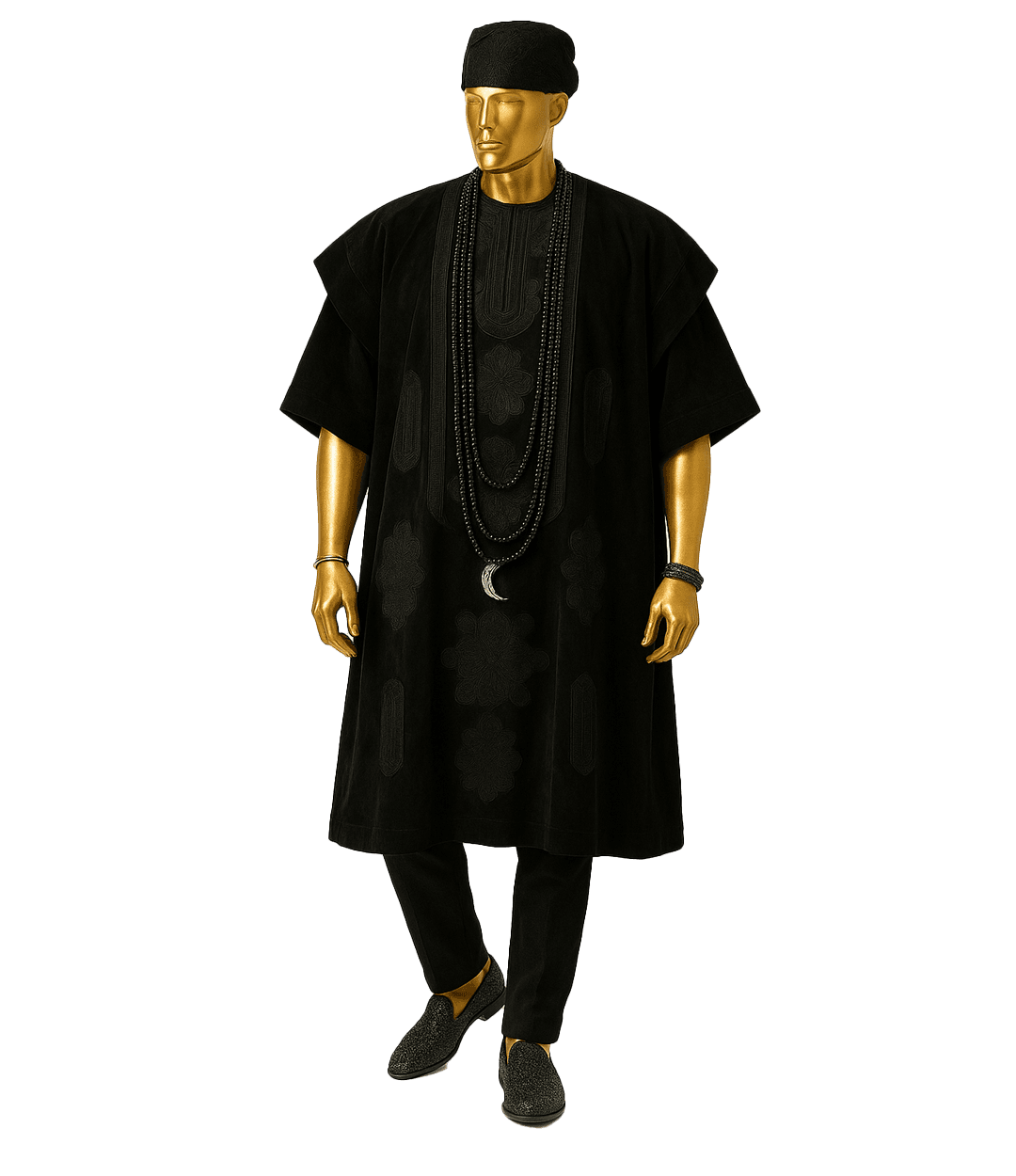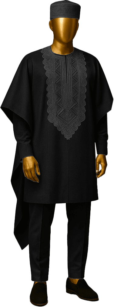 Embrace timeless nobility with this magnificent all-black Agbada ensemble that commands respect and admiration. This complete three-piece set represents the pinnacle of Nigerian traditional menswear, designed for the man of status, influence, and impeccable taste. The outfit features a grand flowing Agbada with dramatic wide sleeves and an impressive silhouette that speaks to royalty and distinction. The centerpiece showcases exquisite vertical embroidery running down the chest panel, creating subtle texture and depth against the rich black fabric. Underneath, a matching long-sleeved inner top (Dashiki) provides layered sophistication, paired with coordinating straight-leg trousers. The ensemble is completed with a traditional black Kufi cap, creating a cohesive, powerful look from head to toe.