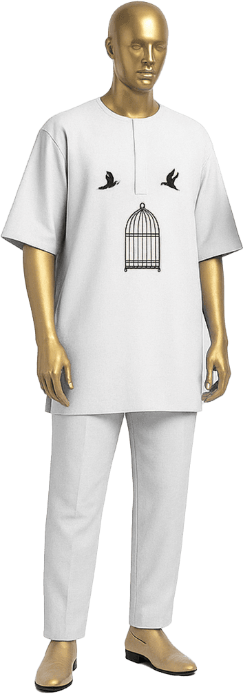 Unique white short-sleeved kaftan featuring striking artistic embroidery of birds and ornate birdcage on chest. Premium crisp white fabric with contemporary symbolic design rendered in black threadwork. The minimalist base lets the meaningful artwork take center stage. Includes matching white sokoto. This is art meets tradition—the symbolic imagery speaks of freedom, aspiration, and breaking boundaries while honoring cultural roots. For the intellectual, the artist, the free thinker who wears meaning. Perfect for cultural exhibitions, artistic gatherings, contemporary traditional weddings, creative industry events, or making a thoughtful statement at modern celebrations.