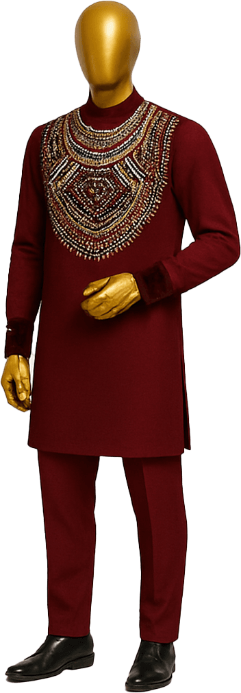 Rich maroon long-sleeved senator ensemble with subtle tonal embroidered panel detailing. The fitted top features delicate embroidery down the chest placket in matching burgundy tones creating understated texture. Round neckline with button accents and streamlined silhouette offer contemporary styling. Paired with coordinating maroon trousers for complete monochromatic elegance. Styled with traditional cap and coral beaded necklace with walking staff for authentic ceremonial presentation. Crafted from quality solid fabric with tone-on-tone embroidery maintaining sophisticated subtlety. The deep burgundy hue exudes warmth and refined elegance. Perfect for cultural ceremonies, traditional events, formal gatherings, religious occasions, or distinguished everyday styling.