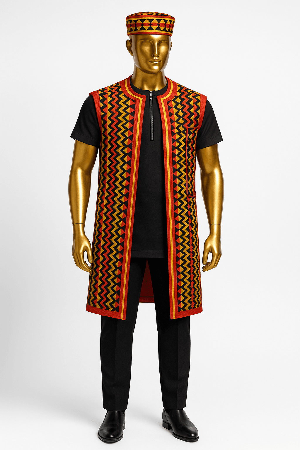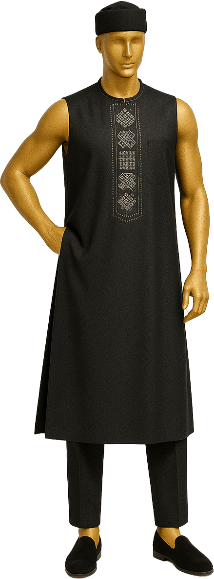 Striking black sleeveless kaftan featuring intricate geometric embroidery panel cascading down the chest. Crafted in premium solid black fabric with traditional threadwork patterns creating stunning visual texture. The sleeveless design offers modern comfort while maintaining cultural authenticity. Complete with matching black cap and coordinating sokoto. This is contemporary tradition for warm-weather celebrations. The sleeveless cut keeps you cool while the detailed embroidery commands respect and attention. The monochromatic palette with textured detail creates depth without distraction. Perfect for outdoor ceremonies, summer weddings, cultural festivals, garden parties, or tropical celebrations where style meets comfort.