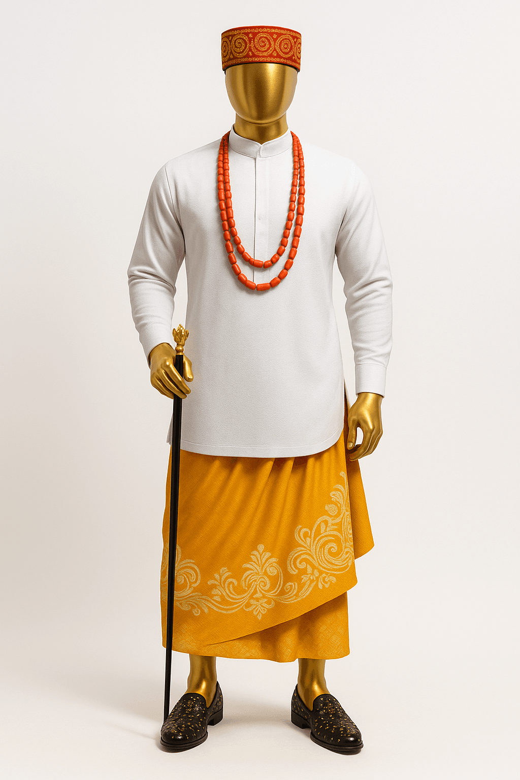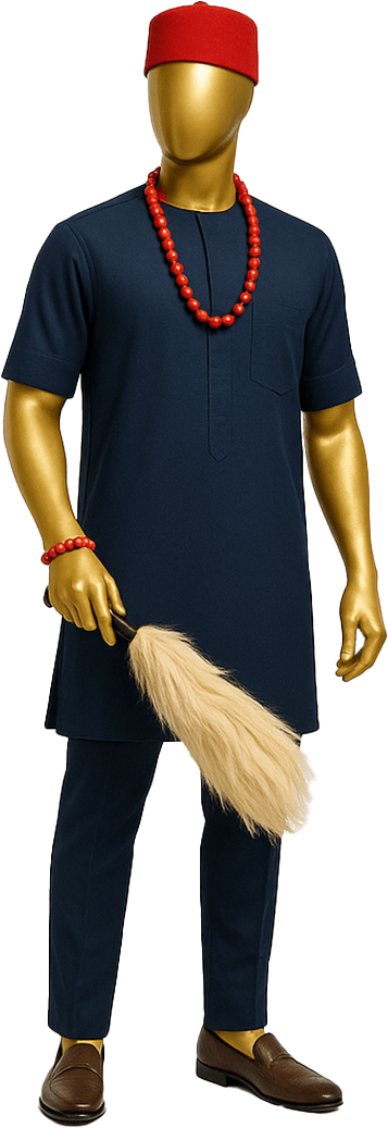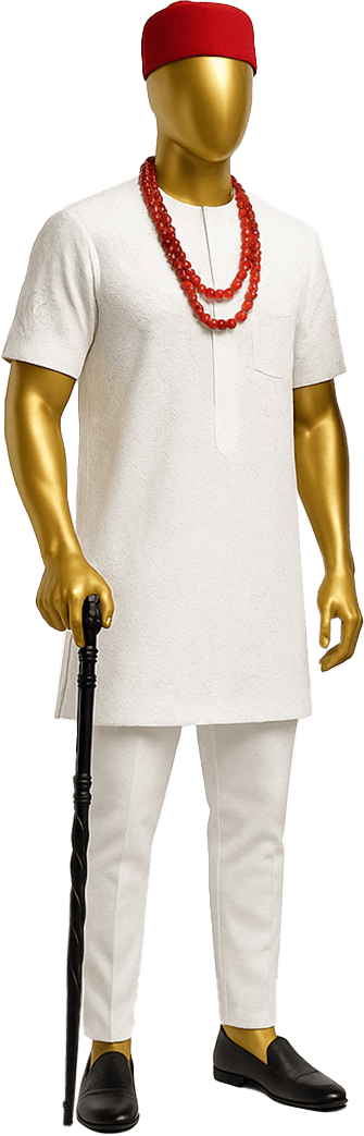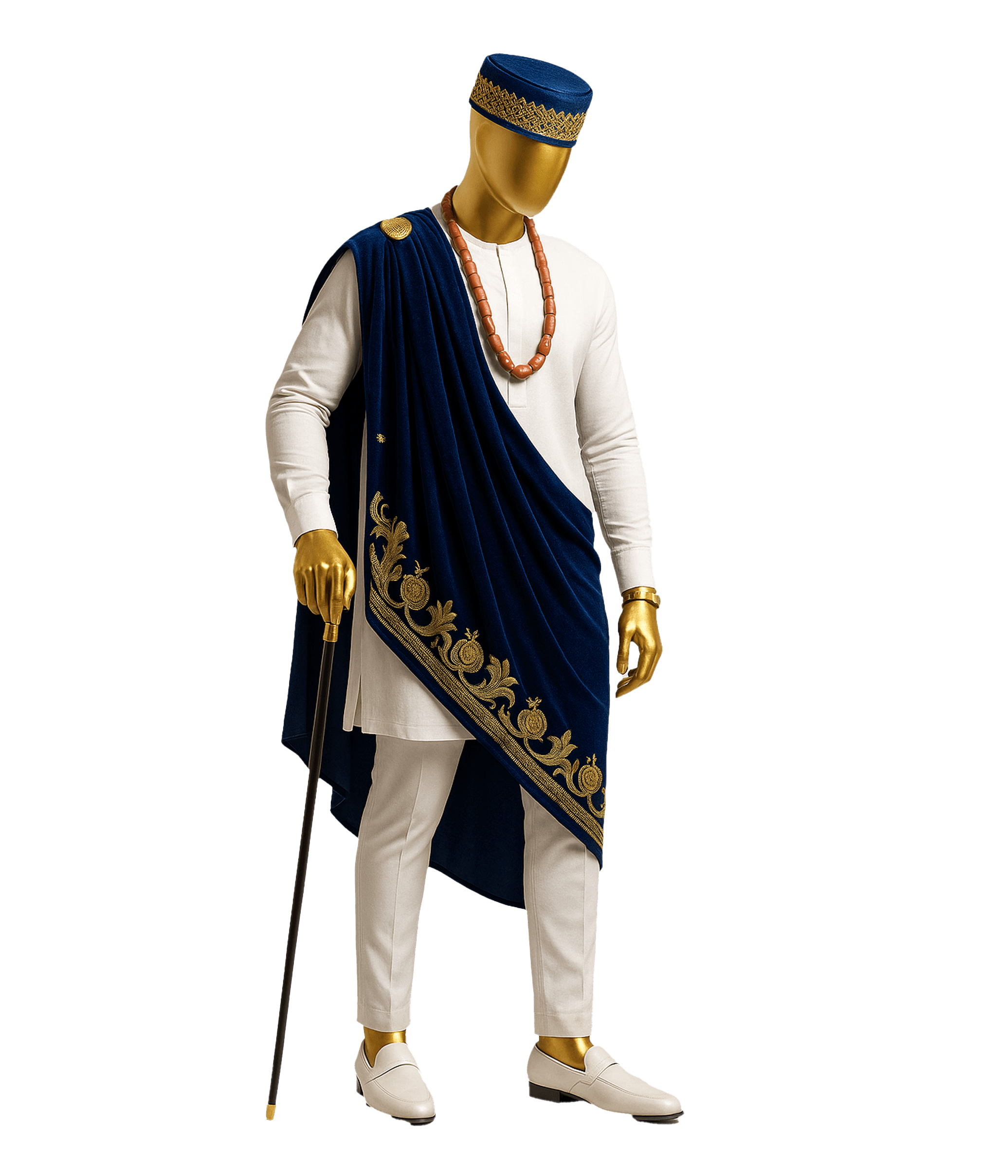 Celebrate Igbo cultural excellence with this distinguished ensemble featuring a crisp white tunic paired with a luxurious navy blue wrapper adorned with golden embroidered borders. The wrapper drapes elegantly across the shoulder and torso, showcasing intricate golden botanical patterns along its edges that speak to craftsmanship and heritage. Complete with matching navy cap embellished with golden detailing, coral beads, and ceremonial walking staff, this set represents the pinnacle of Eastern Nigerian traditional sophistication. Perfect for cultural ceremonies, title-taking events, and prestigious gatherings where honoring Igbo heritage matters. The contrast between pristine white and deep navy creates visual drama, while the golden embroidery adds royal distinction. This ensemble commands respect and admiration at any traditional function. Pair with white leather footwear to maintain the elegant color story.