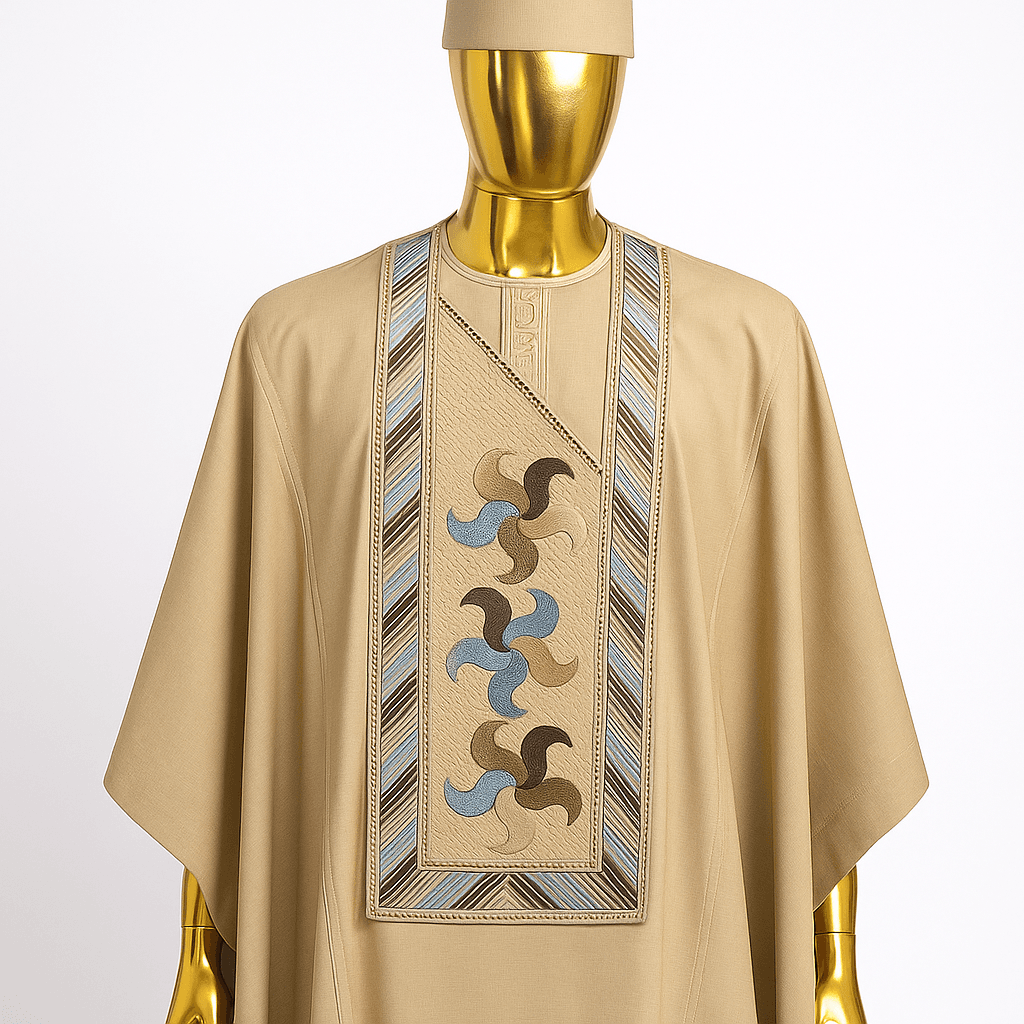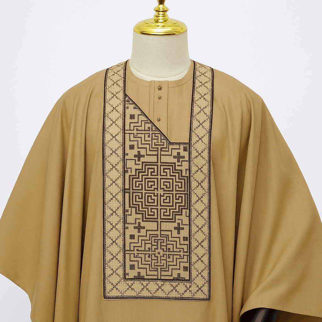 Discover architectural elegance with this exquisite detail shot showcasing golden honey Agbada fabric with intricate brown labyrinth embroidery. This close-up reveals the exceptional craftsmanship of ornate geometric patterns, perfect for the gentleman who appreciates fine detailing and symbolic design. This stunning detail highlights soft golden honey fabric elevated by elaborate brown embroidered labyrinth pattern featuring maze-like geometric designs framed by lattice borders and four-pointed star motifs. The intricate threadwork creates three-dimensional texture and visual depth. The labyrinth pattern symbolizes life's journey, wisdom, and perseverance. Part of a complete Agbada ensemble with matching fabric, this piece represents the pinnacle of traditional embroidery craftsmanship. The mandarin collar with button details adds refined finishing. Perfect for gentlemen who value exceptional artistry and symbolic meaning in their traditional wear. Custom-tailored to showcase the intricate embroidery perfectly.