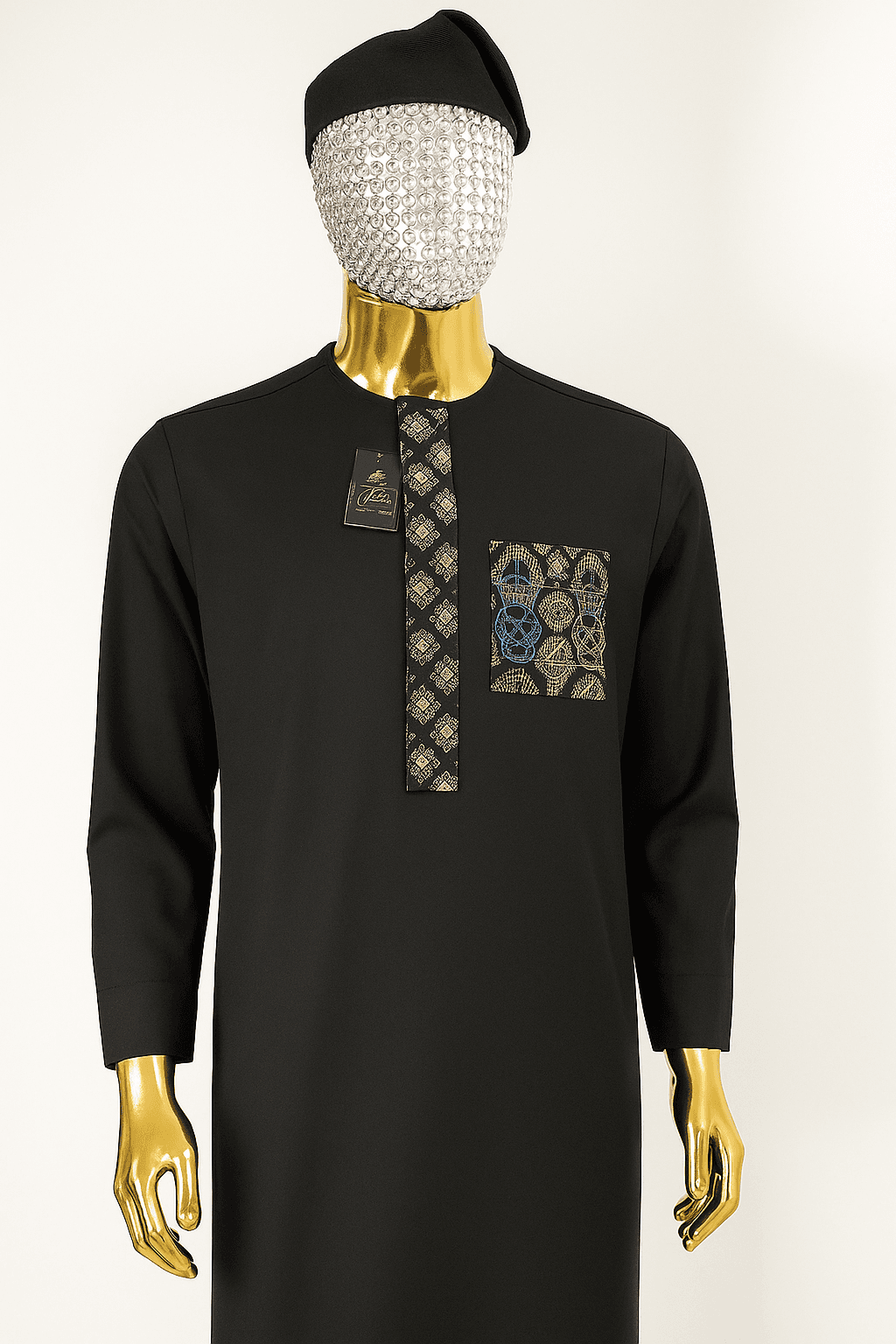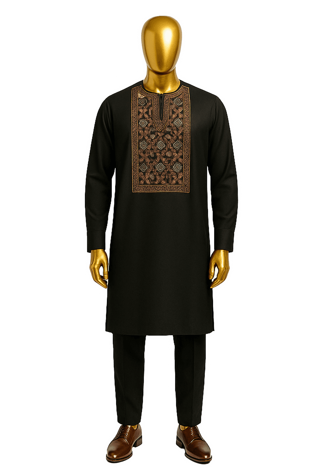 Discover timeless grace in this classic black kaftan adorned with bronze geometric embroidery across the chest. The long-sleeved design offers comfortable elegance while the metallic detailing adds dimension and cultural authenticity. This versatile piece transitions beautifully from religious observances to family celebrations, making it an essential addition to any traditional wardrobe. Pair with matching trousers for a complete refined look.