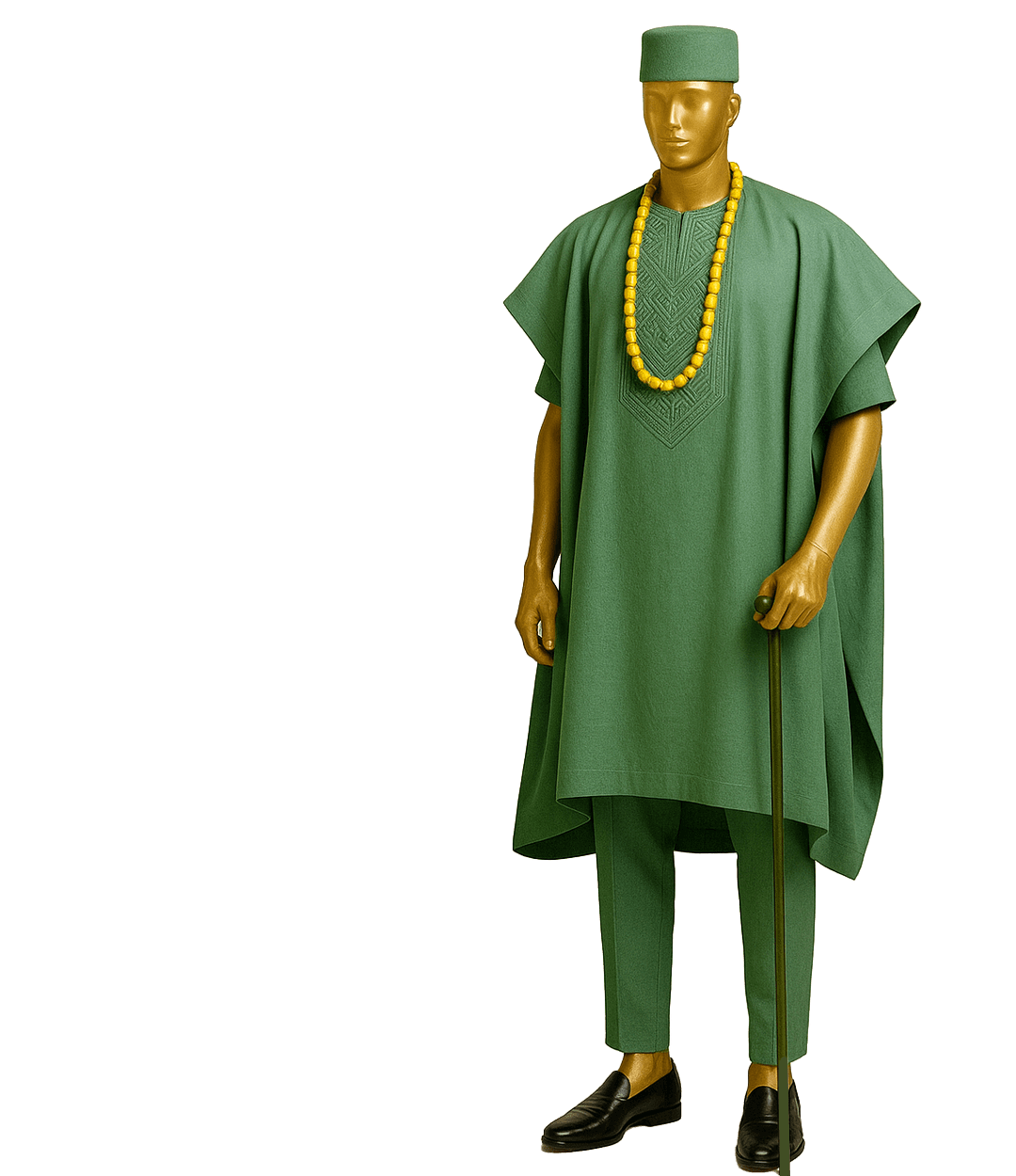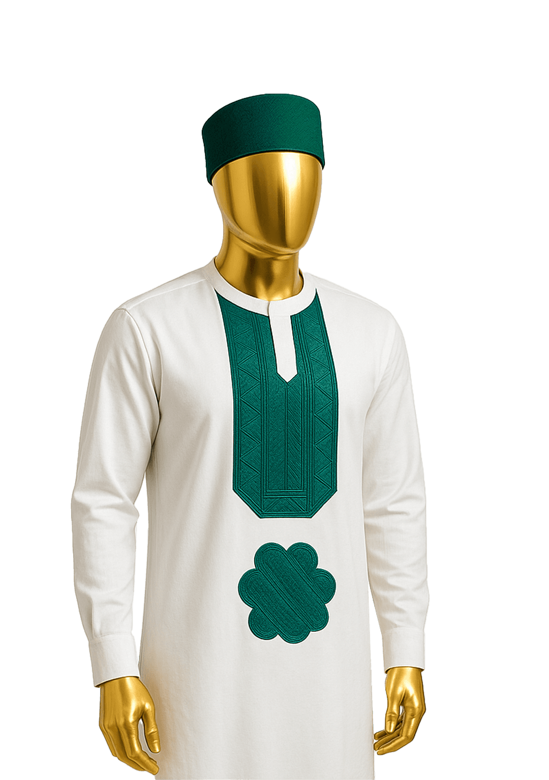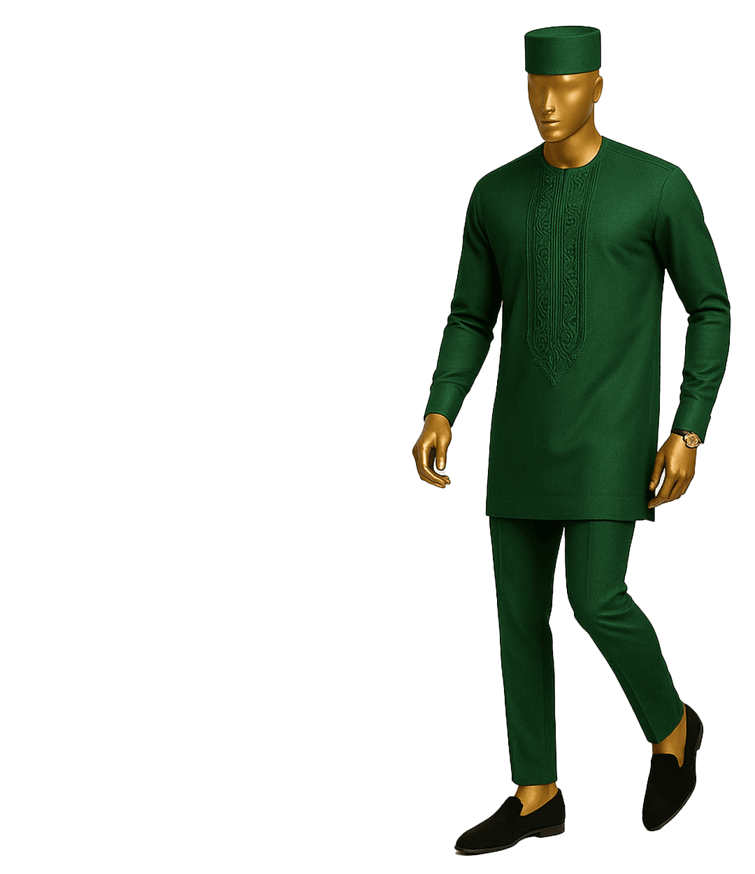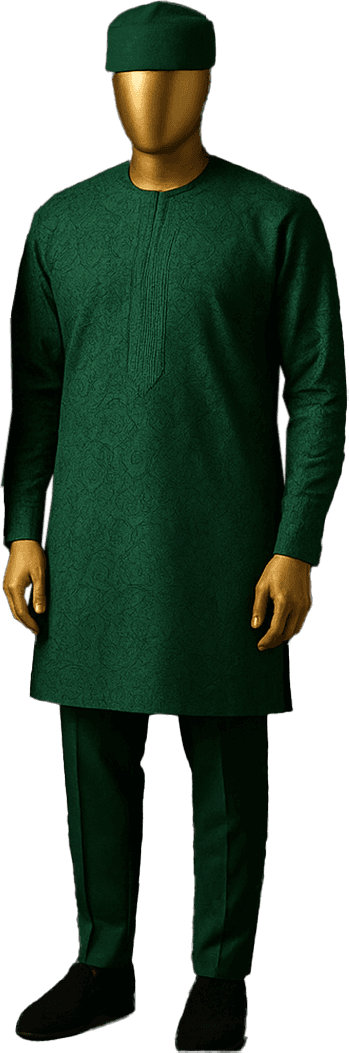 Command regal attention with this stunning emerald green Agbada ensemble featuring intricate embroidery and dramatic flowing design. This luxurious three-piece set embodies traditional Nigerian royalty with a fresh, vibrant color palette, perfect for the distinguished gentleman who appreciates both heritage and contemporary style. The outfit showcases a magnificent flowing Agbada in rich emerald green fabric with an elaborate embroidered chest panel featuring geometric diamond patterns in tonal threading. The dramatic wide sleeves and asymmetric hem create impressive movement and presence. The ensemble includes matching trousers and a coordinating emerald Kufi cap, delivering a complete, cohesive royal look that radiates prosperity and cultural pride.