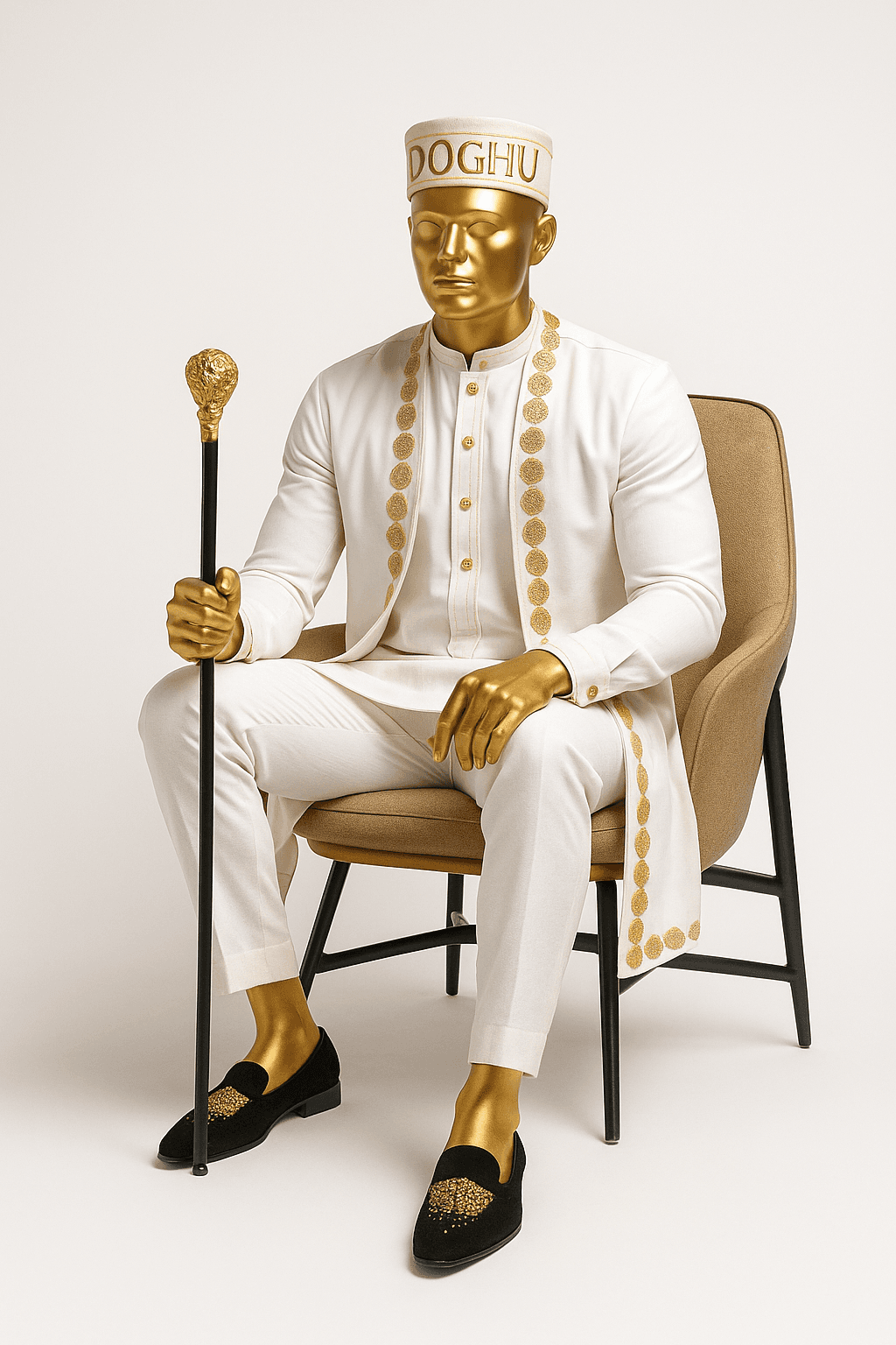 This timeless all-white short-sleeved Senator tunic features simple clean lines with minimal embellishment. Paired with white trousers, red cap, multiple strands of red coral beads, and black walking stick, this ensemble balances simplicity with striking accessories. The pristine white base allows bold red accessories to create visual impact. The short-sleeved design offers comfortable elegance for extended celebrations. Easy to personalize with different colored caps and beads while maintaining sophisticated presentation.