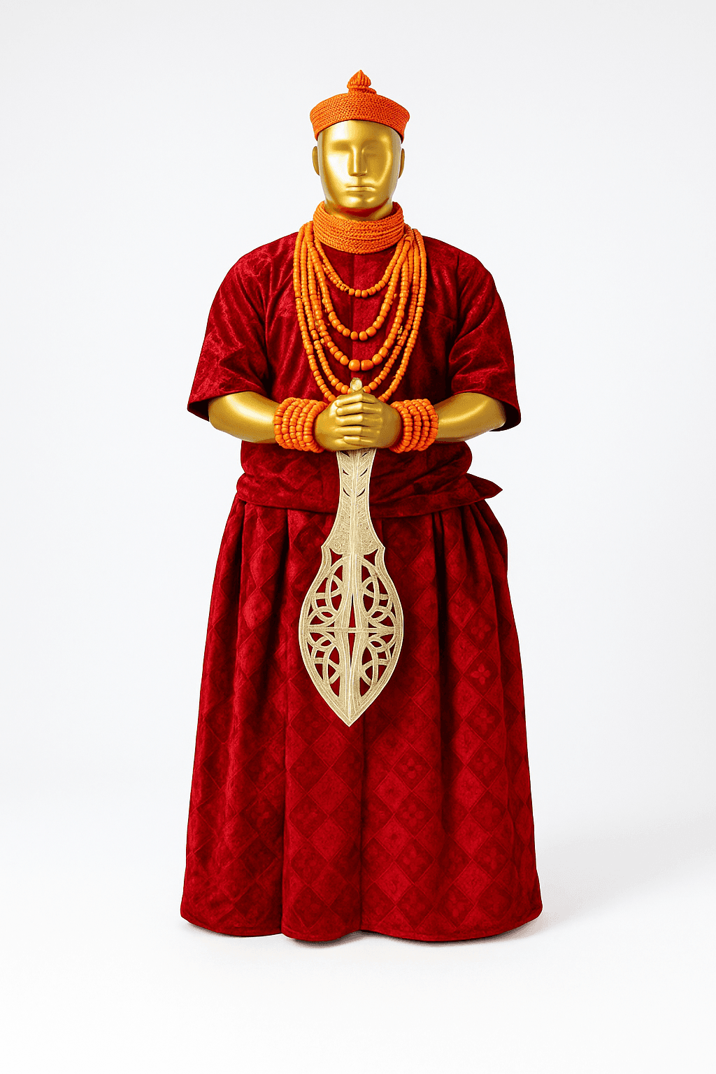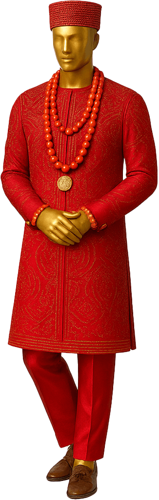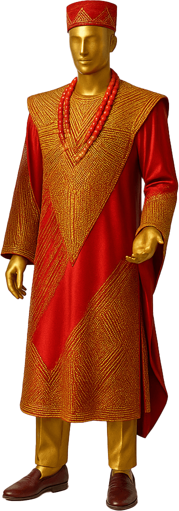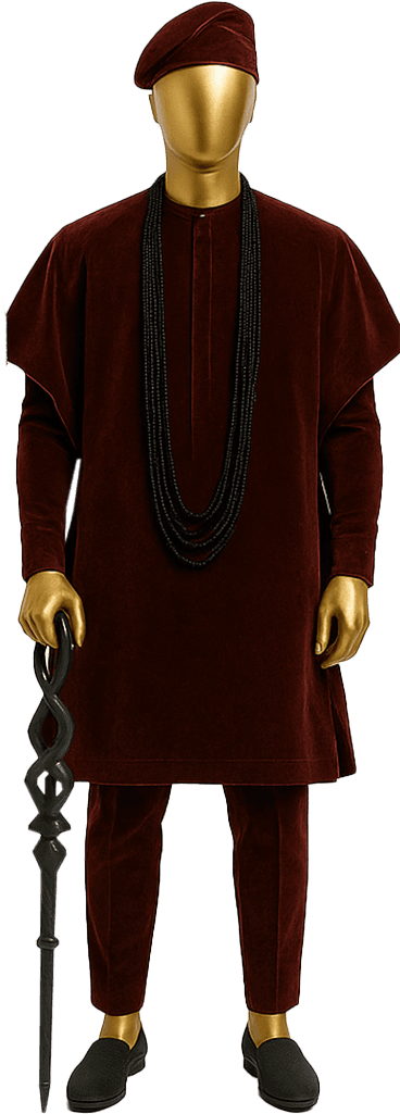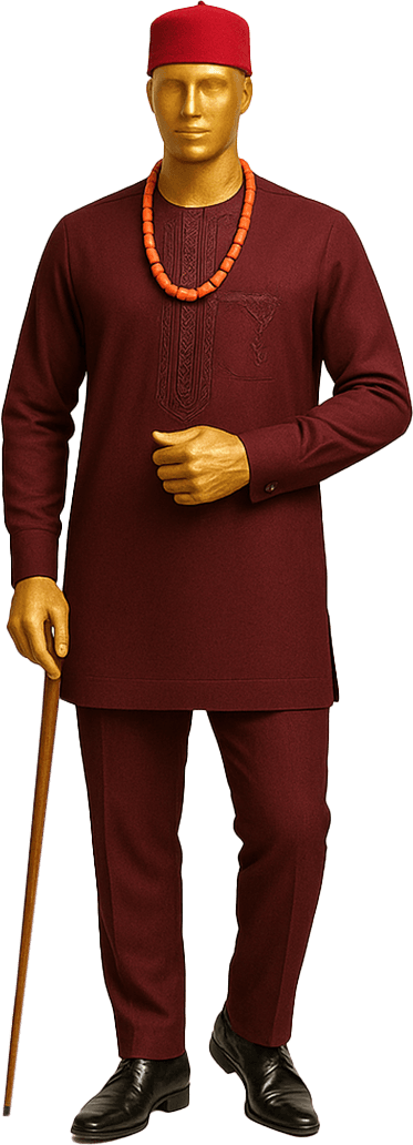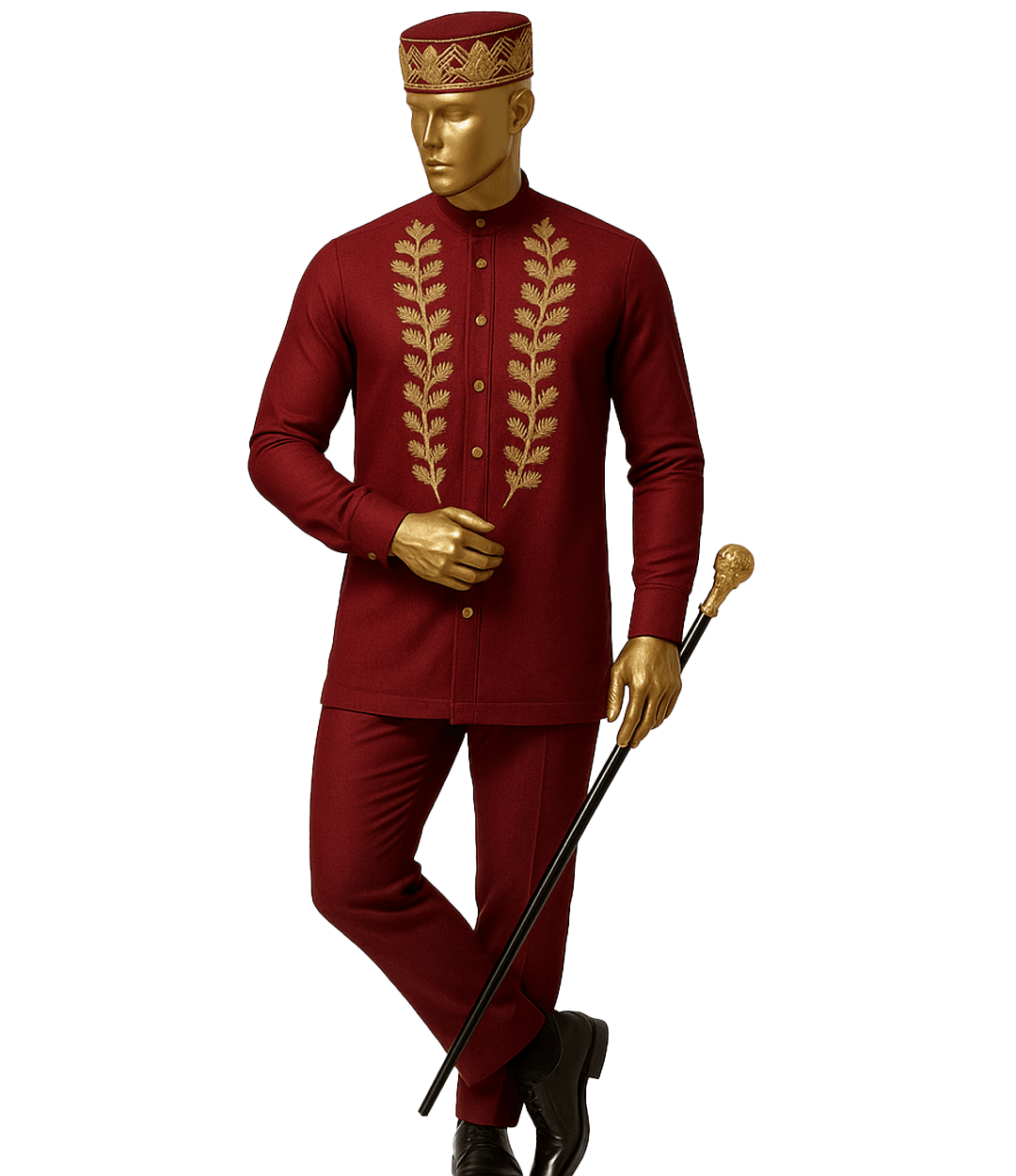 Channel ancestral nobility with this rich wine-red fitted ensemble adorned with golden leaf embroidery and elegant button details. Complete with matching cap and ceremonial walking staff, this regal set speaks to lineage, honor, and sophisticated masculinity. The tailored fit offers modern appeal while the traditional embellishments honor Nigerian royal aesthetics. Perfect for milestone anniversaries and distinguished gatherings.