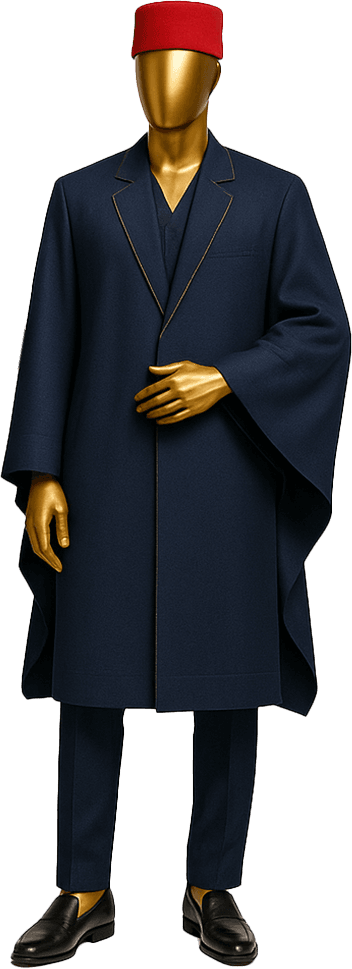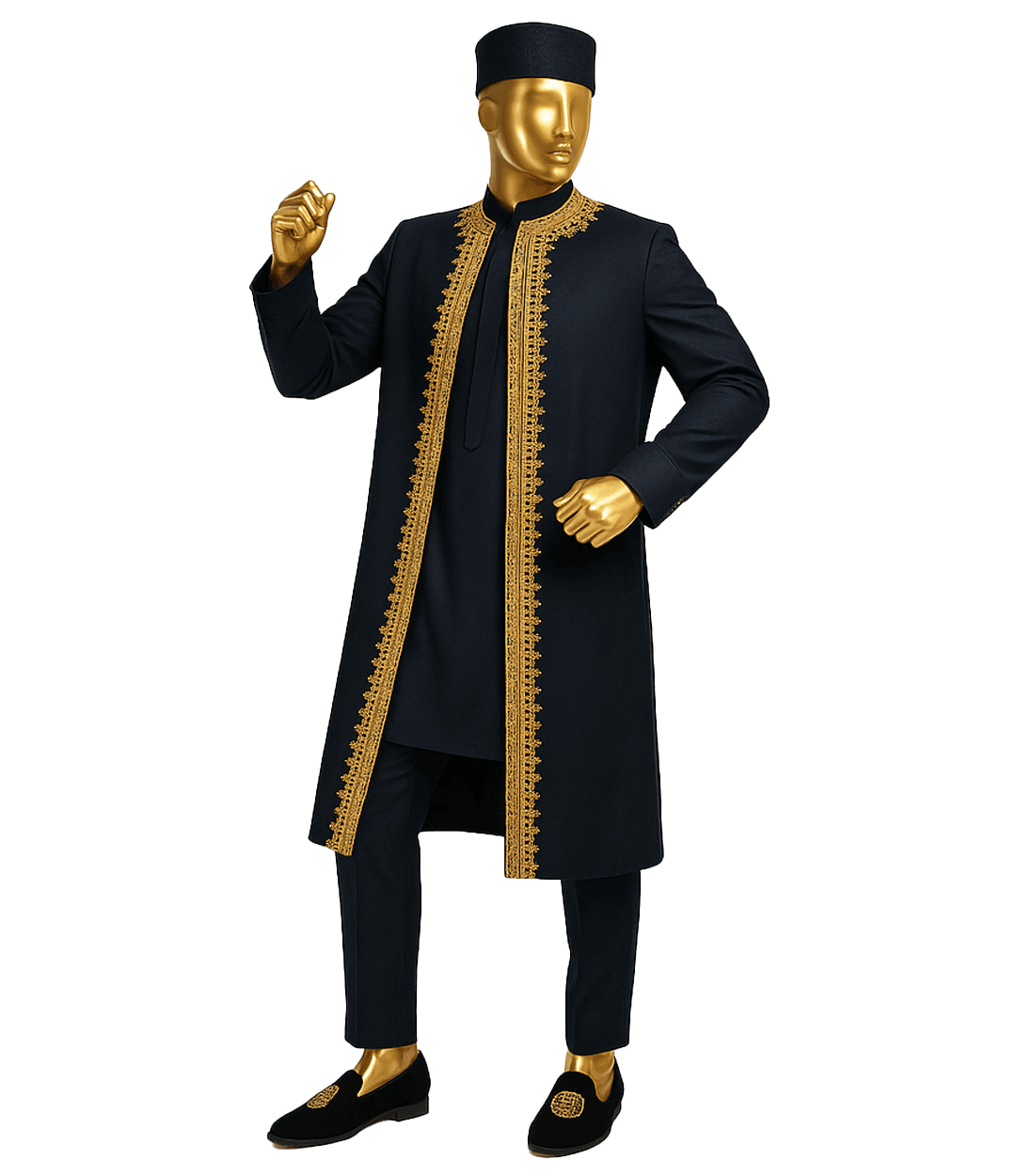 Command executive presence with this striking navy blue coat ensemble featuring luxurious gold embroidered trim. This sophisticated three-piece set combines structured tailoring with ornate detailing, perfect for the distinguished gentleman who appreciates formal elegance and metallic accents. This impressive outfit showcases a long-sleeved navy blue structured coat with dramatic gold embroidered trim running down both front edges, featuring intricate geometric patterns that create regal framing. The mandarin collar adds refined finishing. Worn over a matching navy Kaftan and paired with navy trousers and coordinating black Kufi cap, this complete ensemble delivers powerful formality for diplomatic events, formal ceremonies, upscale cultural gatherings, and occasions requiring distinguished, authoritative presence. The navy and gold combination conveys leadership, prosperity, and timeless elegance. Custom-tailored to your exact measurements for perfect structured fit.