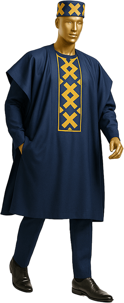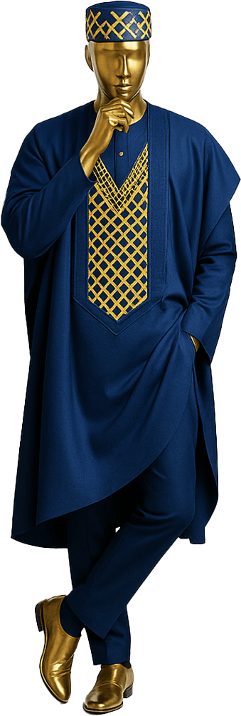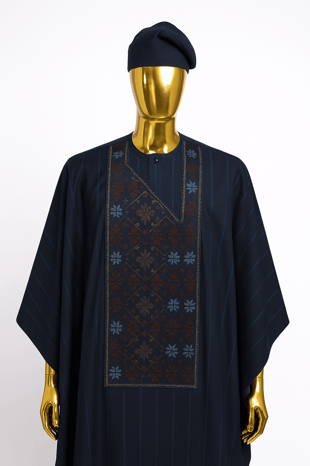 Regal navy blue complete agbada set with spectacular golden lattice embroidered panel. The flowing outer robe features wide sleeves and generous drape creating commanding silhouette. Stunning golden embroidered lattice design adorns the chest in diamond grid pattern with intricate detailing. Fitted inner kaftan layers beneath with coordinating navy trousers. Styled with matching embroidered cap featuring golden geometric pattern. Crafted from premium solid navy fabric with expert golden threadwork. The rich navy base paired with metallic golden embellishment creates sophisticated luxury. Convenient side pockets add functional elegance. Perfect for weddings, chieftaincy ceremonies, formal events, cultural celebrations, or distinguished occasions.