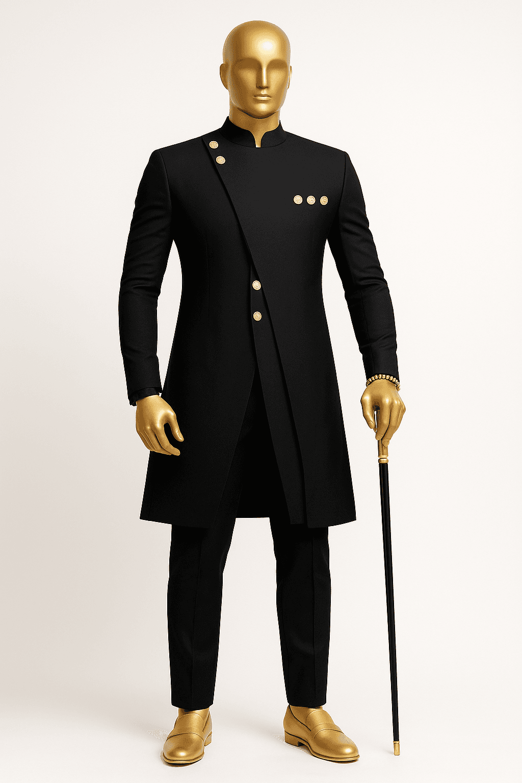 Make a sophisticated statement with this elegant black Kaftan ensemble featuring luxurious brocade accent panels and contemporary styling. This refined two-piece set combines monochromatic elegance with textured details, perfect for the fashion-forward gentleman who appreciates subtle luxury and modern edge.This striking outfit showcases a long-sleeved Kaftan in deep black fabric, elevated by eye-catching gold and blue brocade accent panels on the chest placket and pocket. The ornate brocade features traditional damask patterns that add richness and visual interest to the minimalist black base. The round neckline with geometric brocade trim creates contemporary framing. Paired with matching black straight-leg trousers, this two-piece ensemble delivers sophisticated style for upscale evening events, fashion-forward gatherings, contemporary cultural celebrations, and occasions requiring modern elegance with traditional roots. The black base with luxe accents makes this incredibly versatile. Custom-tailored to your exact measurements for impeccable fit.