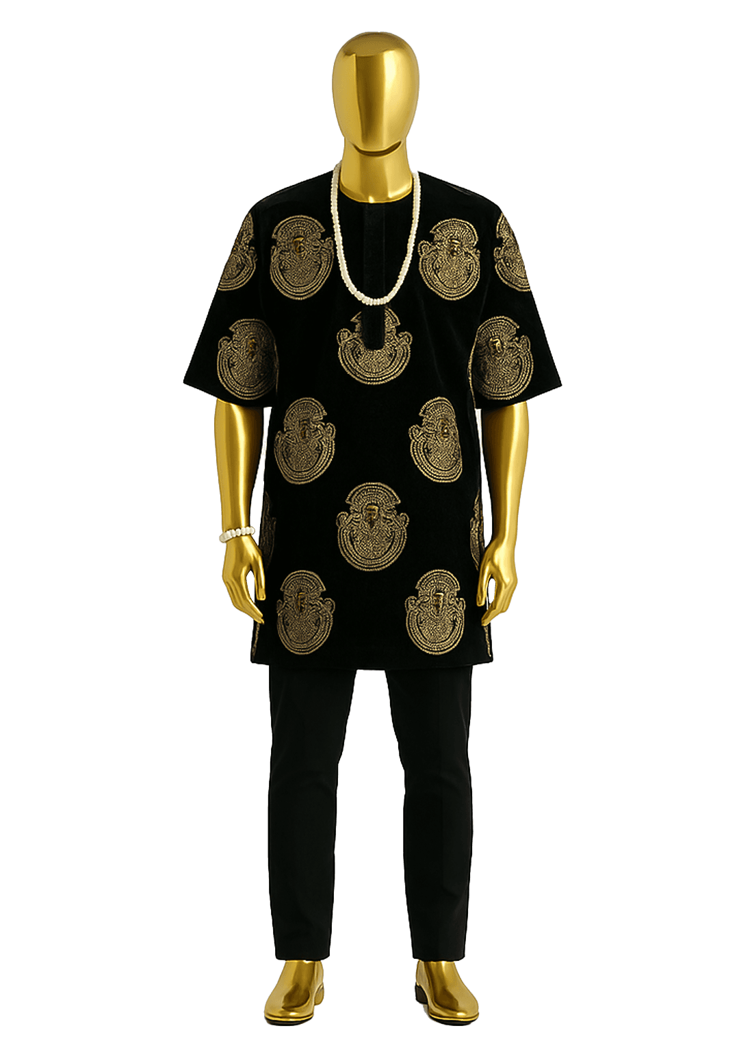 Make an unforgettable entrance in this bold black ensemble featuring oversized golden medallion appliqués that represent ancestral heritage and royal lineage. The short-sleeved tunic creates a dramatic silhouette that commands respect and admiration. This is more than clothing—it's a conversation piece that celebrates Nigerian cultural identity with contemporary confidence. Perfect for festivals, milestone birthdays, and cultural exhibitions.