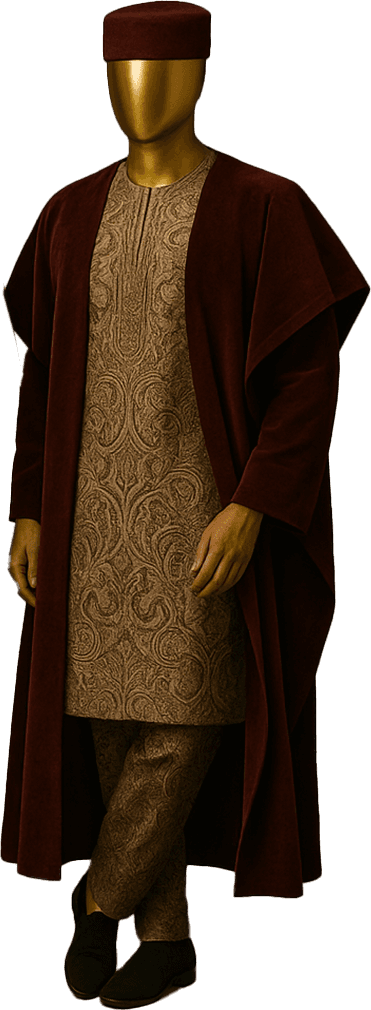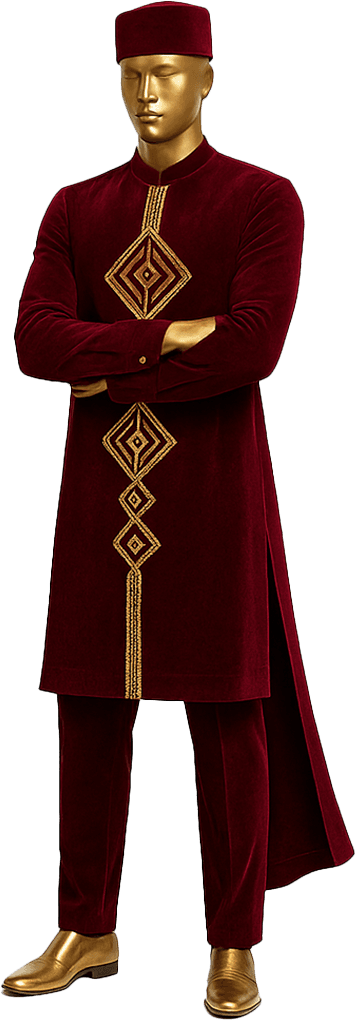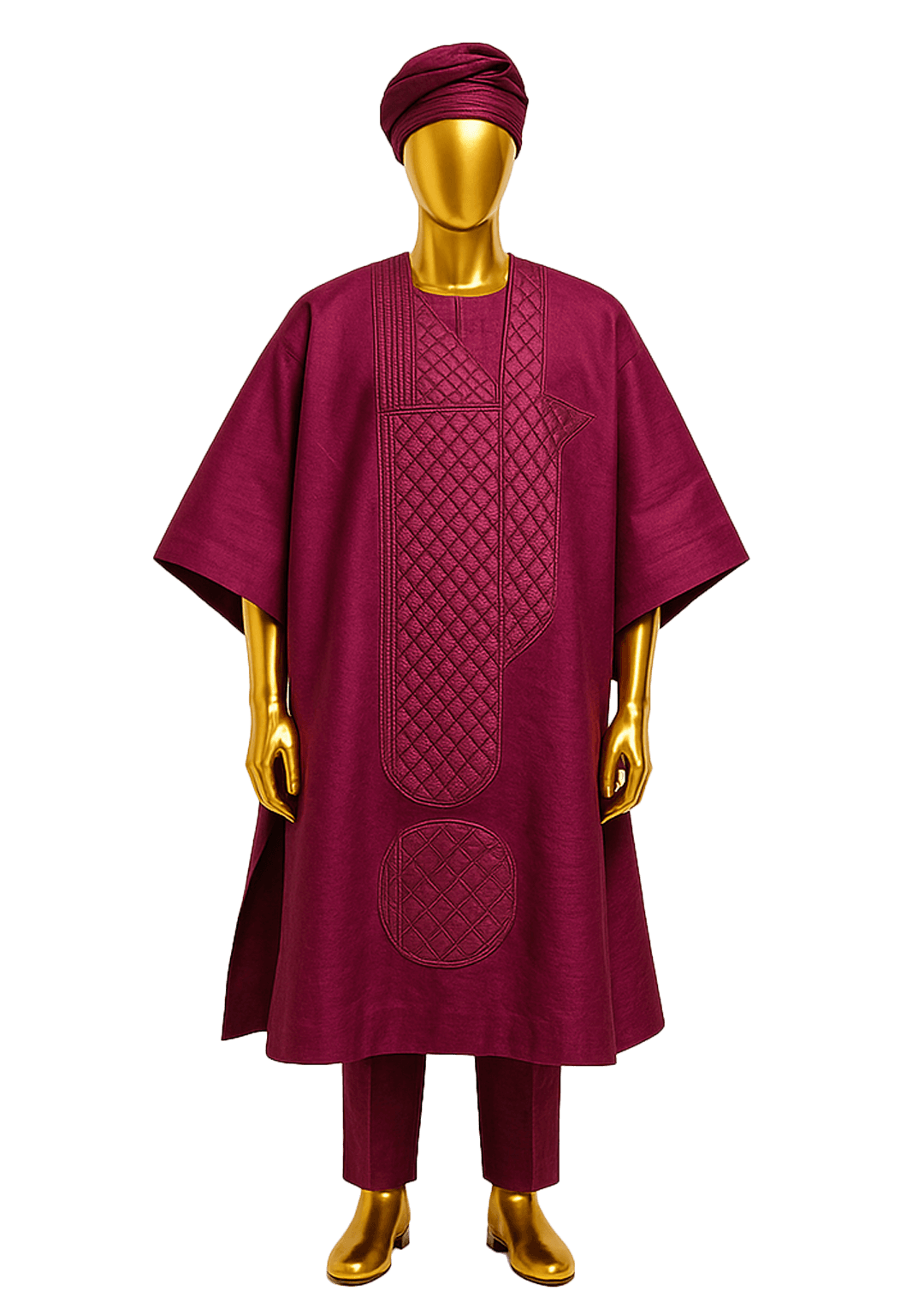 Regal deep burgundy long-sleeved agbada featuring continuous gold geometric embroidery running vertically down the center. Includes flowing outer robe creating majestic silhouette. Premium luxurious fabric with impeccable tailoring. Complete with matching embroidered fila. The centerline embroidery creates elongating elegance. The agbada represents the highest form of traditional menswear—flowing, commanding, royal. The vertical embroidery adds height and prestige. This is for cultural leaders, family patriarchs, distinguished gentlemen. Perfect for chieftaincy ceremonies, major traditional weddings, cultural leadership events, prestigious installations, or moments requiring absolute traditional authority.