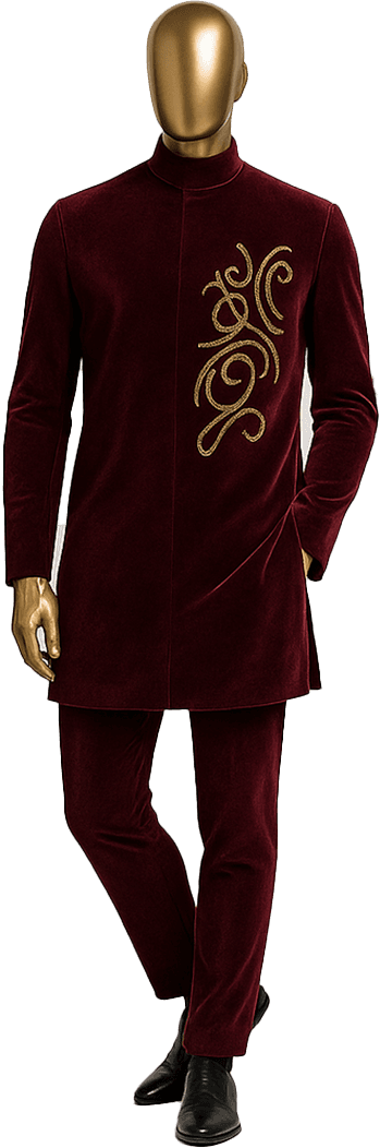 Luxurious deep burgundy velvet senator suit with sophisticated golden embroidery accent. The long-sleeved top features a modern mandarin collar and elegant golden threadwork in artistic swirling patterns on the chest. Crafted from rich, plush velvet fabric that exudes opulence and texture. The subtle sheen of the velvet paired with metallic gold embroidery creates a regal, distinguished aesthetic. Complete with matching burgundy trousers for a streamlined silhouette. The fitted design offers contemporary styling while maintaining traditional sophistication. Perfect for upscale dinners, cocktail events, cultural galas, sophisticated celebrations, or any occasion requiring luxurious refinement.