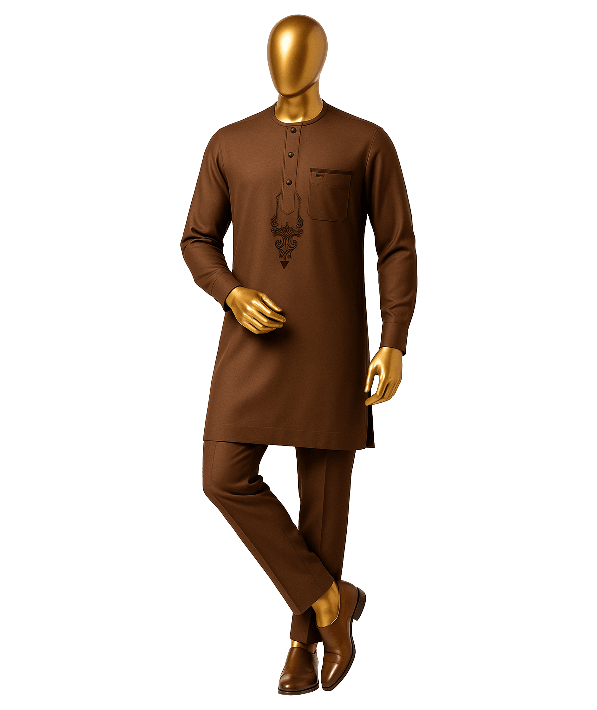 This rich chocolate brown long-sleeved Senator suit features subtle tonal embroidery at the chest pocket and mandarin collar with button placket. The fitted silhouette offers modern tailoring while the earth-toned embroidery maintains traditional aesthetics. Complete with matching brown trousers for a coordinated two-piece look. The chocolate brown color works beautifully across seasons and occasions. The long sleeves and fitted cut create streamlined presentation ideal for professionals. Style with brown or black leather accessories for polished finishing touches.