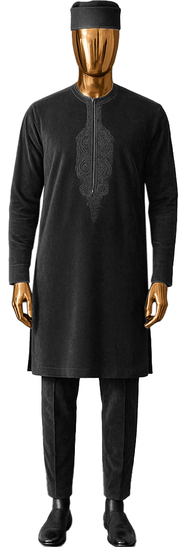 Refined solid black kaftan ensemble featuring subtle tonal embroidered chest panel. The flowing design showcases delicate geometric embroidery in matching black tones creating understated texture. Wide kimono-style sleeves with fitted inner long sleeves add layered sophistication. Coordinating black trousers and matching traditional cap complete the monochromatic look. Made from premium solid fabric with expert tone-on-tone embroidery work. The all-black palette creates powerful understated elegance and timeless appeal. Subtle embellishment maintains contemporary sophistication while honoring traditional craftsmanship. Ideal for formal events, business-formal occasions, contemporary ceremonies, sophisticated gatherings, or commanding presence with quiet luxury.