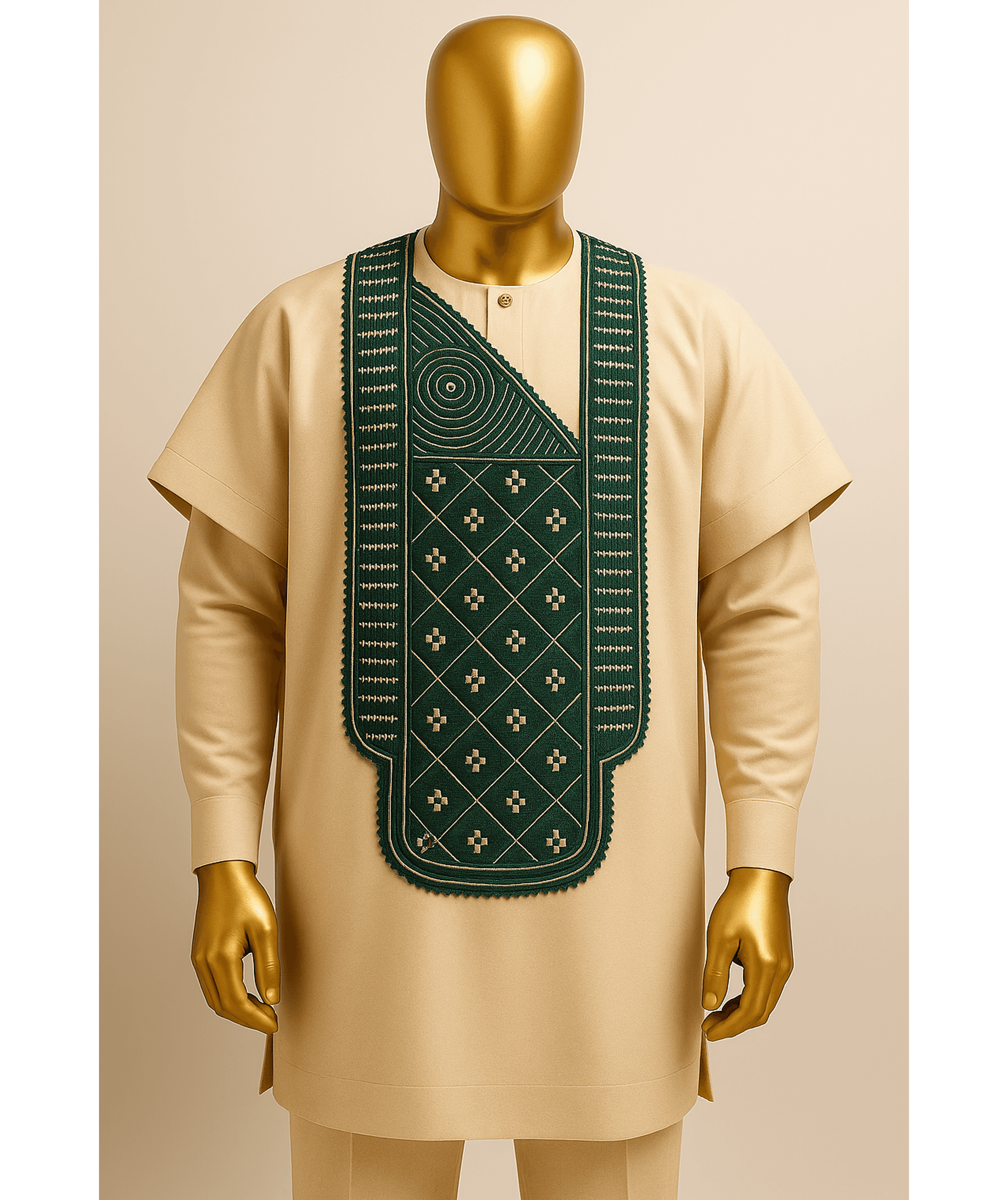 Sophisticated cream long-sleeved senator featuring striking forest green embroidered chest panel. The elongated embroidered bib showcases intricate geometric patterns with golden accents creating visual richness. Circular and diamond motifs combine with detailed borders for stunning craftsmanship. Made from premium cream solid fabric providing clean backdrop for the elaborate embellishment. Long sleeves with fitted styling offer refined contemporary look. The contrast between cream base and deep green embroidery creates elegant sophistication. This piece beautifully balances traditional embroidery techniques with modern silhouette. Perfect for cultural leadership events, distinguished gatherings, upscale celebrations, or showcasing exceptional craftsmanship.