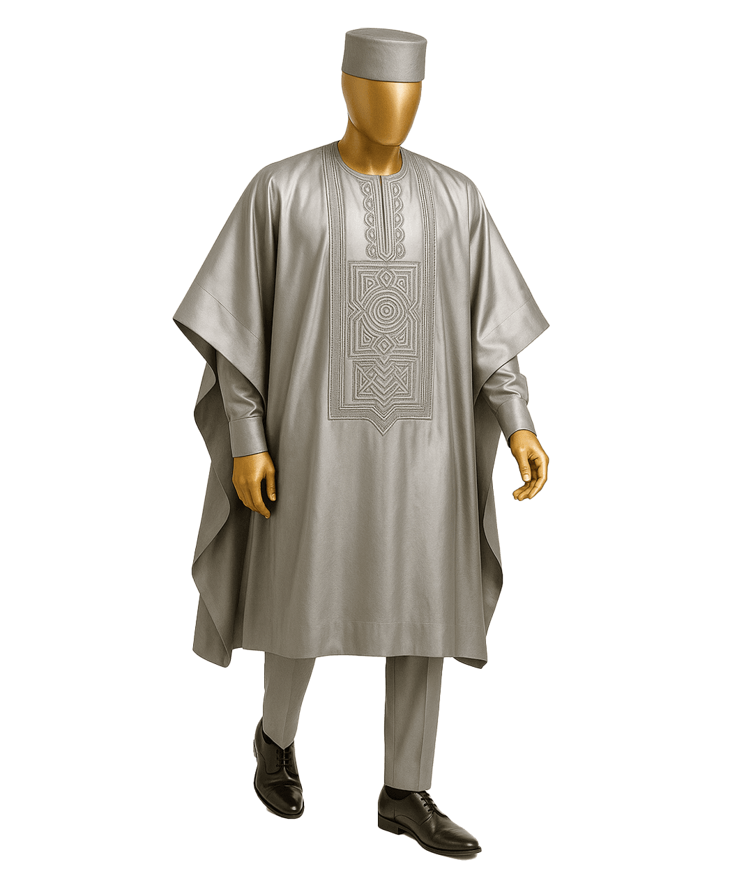 Embrace modern elegance with this sophisticated silver sage Agbada featuring white geometric embroidery. This refined four-piece set combines contemporary color with intricate detailing, perfect for the gentleman who appreciates fashion-forward neutrals and symbolic patterns. This distinguished outfit showcases a short-sleeved Agbada in lustrous silver sage fabric, adorned with beautiful white embroidered geometric designs featuring concentric circles and lattice patterns arranged vertically on the chest. The contrast embroidery adds refined sophistication. The traditional wide-sleeve design creates elegant presence with modern edge. Complete with matching silver sage trousers, inner long-sleeved top, and a coordinating silver Kufi cap, this complete ensemble delivers contemporary sophistication for fashion-forward weddings, modern cultural events, upscale celebrations, and occasions requiring distinctive, refined style. The silver sage conveys modernity, calm, and sophisticated taste. Custom-tailored to your exact measurements.