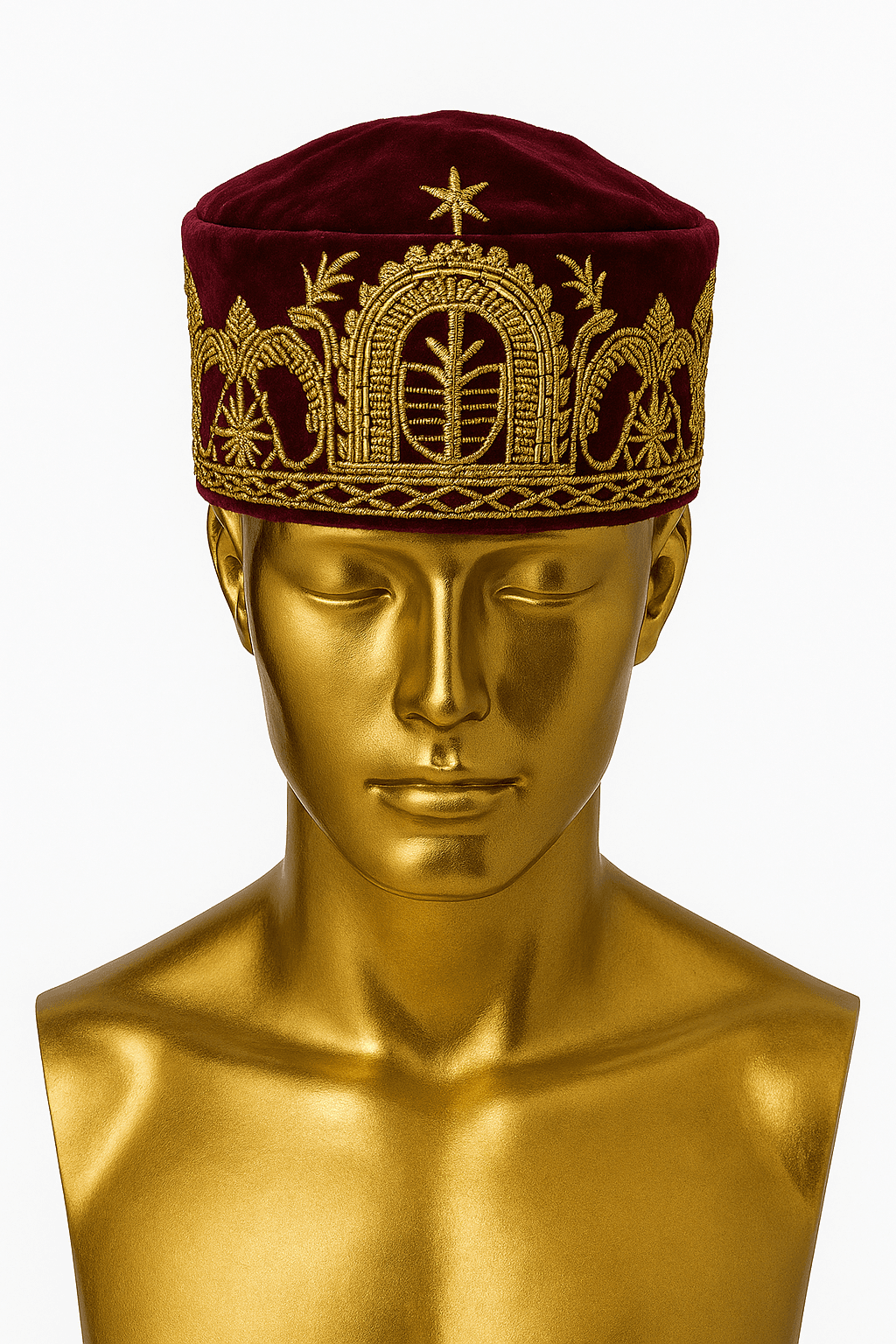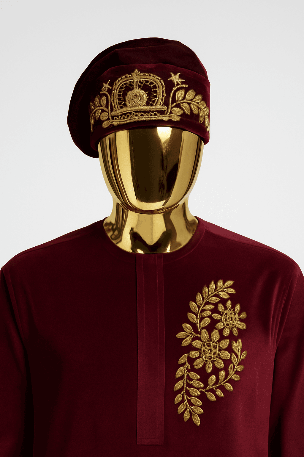 Crown your ensemble with this magnificent deep burgundy velvet cap featuring elaborate golden embroidery across the entire surface. Palm fronds, botanical motifs, and geometric patterns create a three-dimensional tapestry of craftsmanship that speaks to royal heritage. The structured crown showcases expert needlework with each golden thread contributing to the narrative of nobility, prosperity, and ancestral wisdom. Essential for completing ceremonial attire at the highest level of cultural celebrations—chieftaincy installations, royal coronations, and prestigious traditional gatherings. This is more than headwear; it's a symbol of authority, spiritual elevation, and connection to centuries of Nigerian royal tradition. The velvet and gold combination creates timeless regal sophistication.