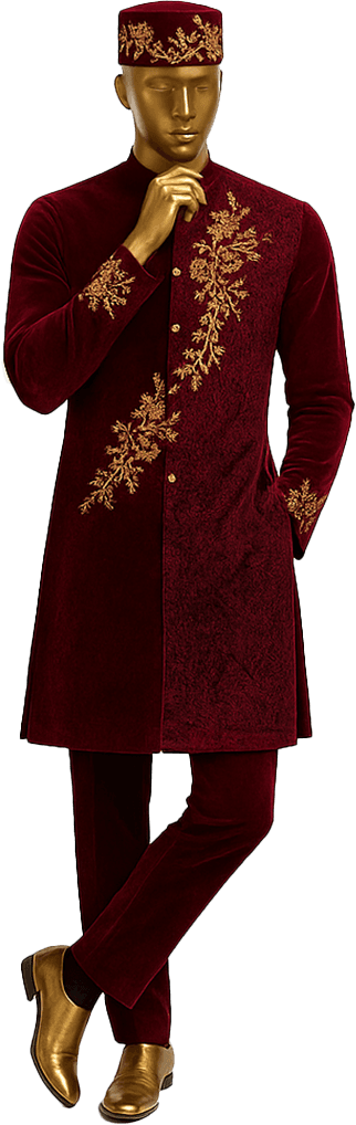 This stunning deep burgundy velvet ensemble features a coordinating embroidered cap and tunic in matching fabric. The cap showcases elaborate golden embroidery including crown motifs and botanical patterns across the entire surface. The long-sleeved tunic displays golden leaf embroidery on the chest pocket area, creating a cohesive look. The rich burgundy velvet offers luxurious texture while the golden threadwork adds visual interest and elegance. Pair this set with burgundy or black trousers for formal occasions. The velvet fabric drapes beautifully and photographs exceptionally well, making it ideal for special events and celebrations. The matching cap and tunic create a polished, intentional presentation.
