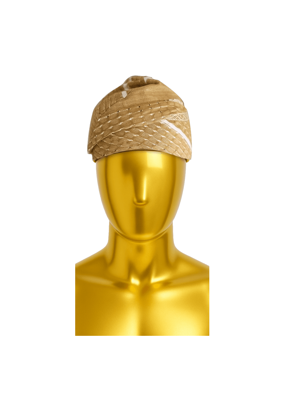 Elevate your traditional look with this luxurious champagne gold Aso-Oke cap featuring elegant embossed detailing. This premium handwoven accessory represents the pinnacle of Nigerian traditional craftsmanship, perfect for the gentleman who demands excellence in every detail. This beautifully crafted cap showcases authentic Aso-Oke fabric in a sophisticated champagne gold tone with raised textured patterns woven throughout, creating a three-dimensional effect that catches light beautifully. The traditional wrap-style construction features decorative pearl-like embellishments that add a touch of luxury and distinction. The structured design maintains its elegant shape while providing comfortable all-day wear.
