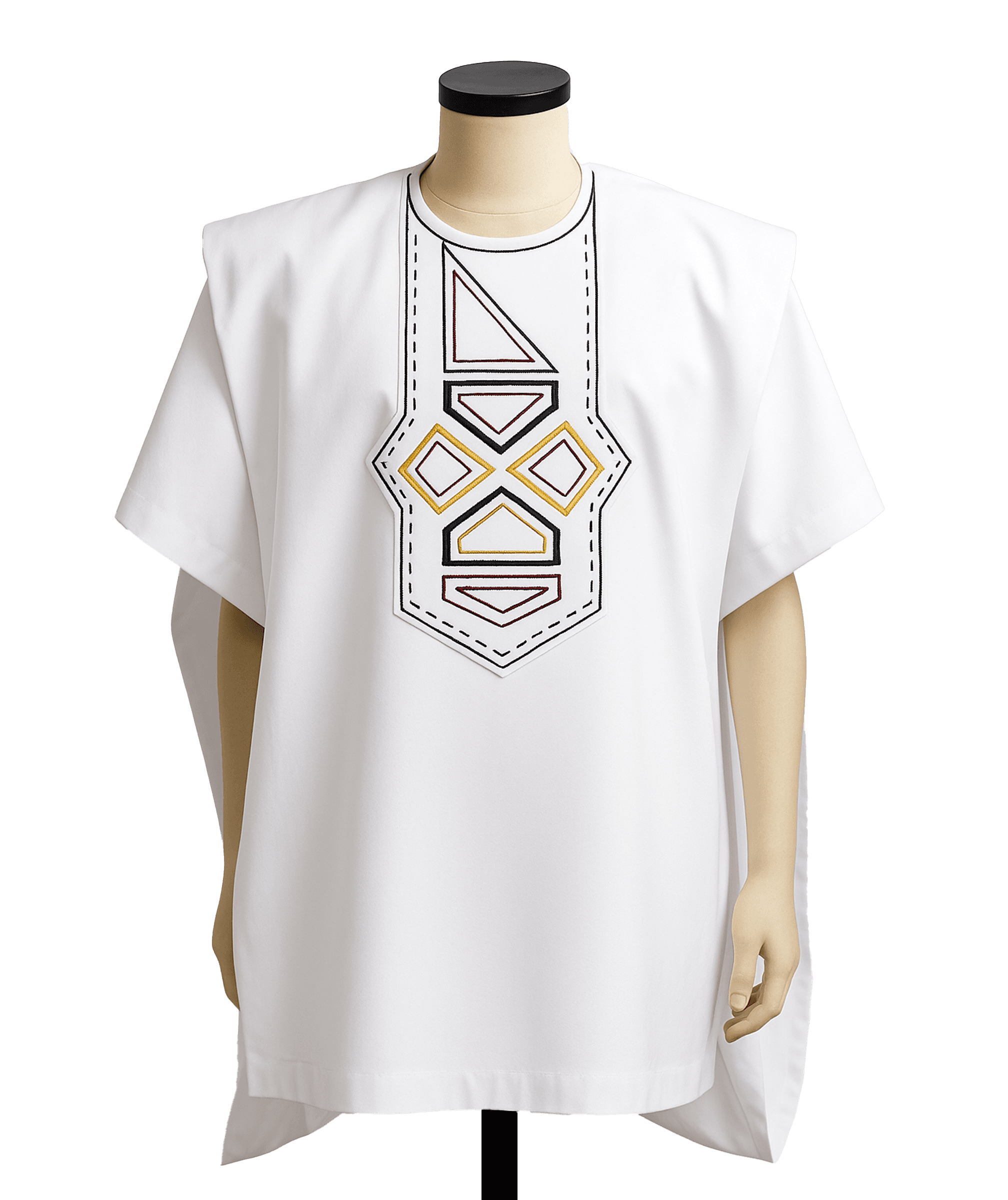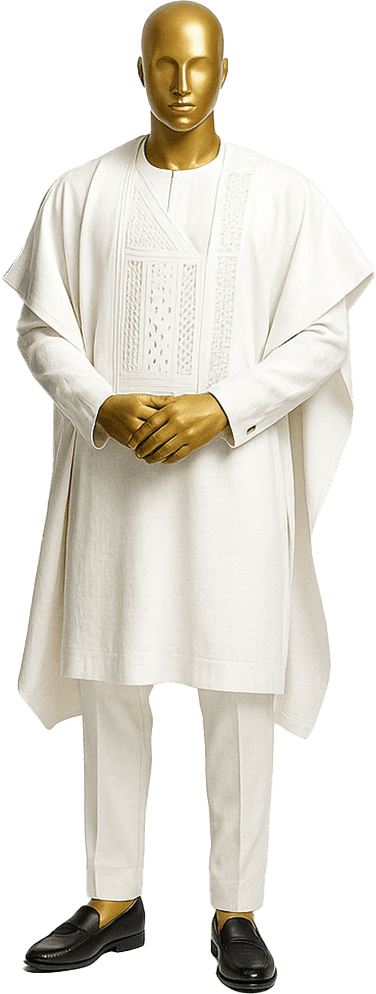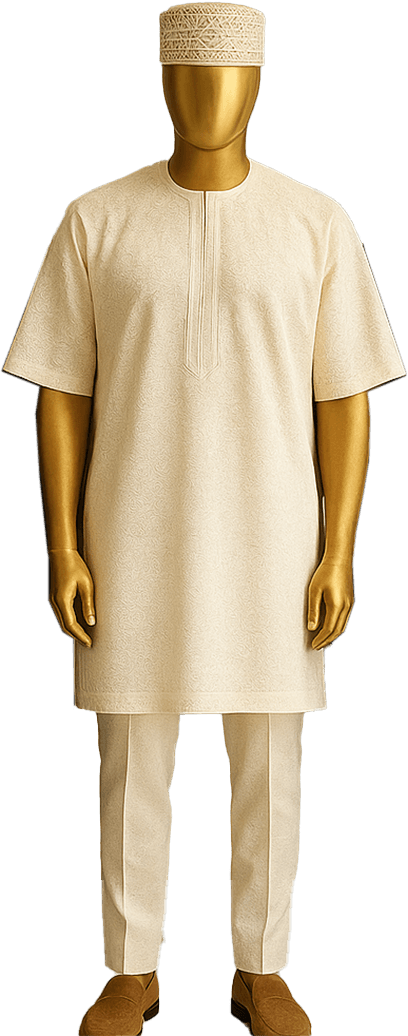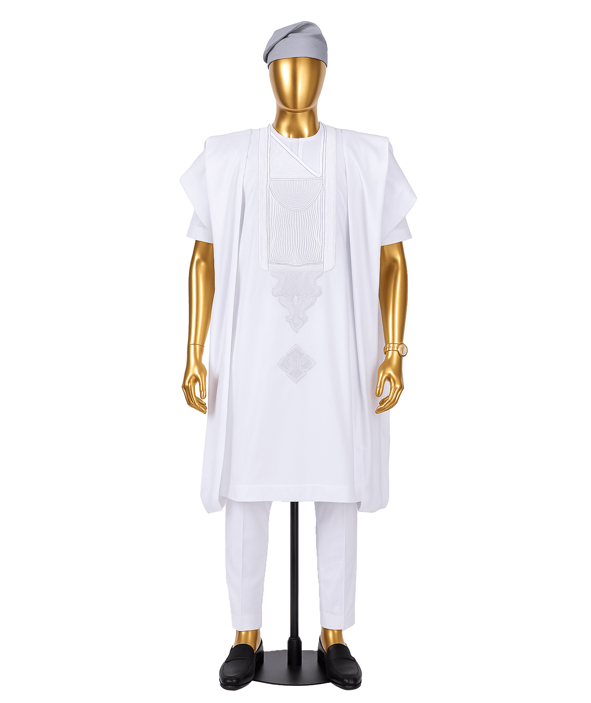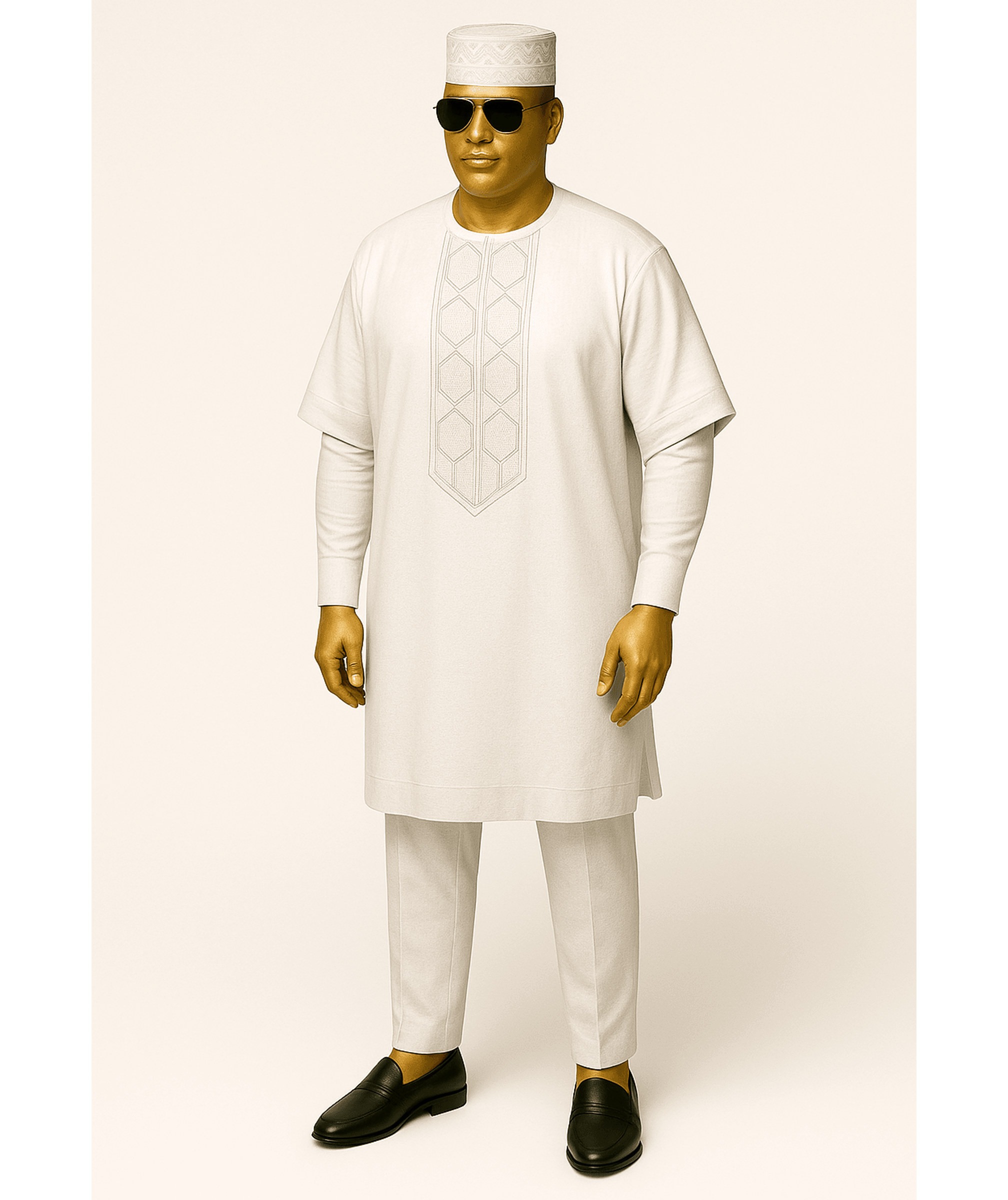 Embrace pristine elegance with this all-white ensemble that radiates sophistication and cultural pride. The short-sleeved tunic features delicate tonal embroidery forming geometric patterns down the chest, creating subtle texture and visual interest against the crisp ivory fabric. The wide, flowing silhouette offers comfort and commanding presence, while the matching trousers and embroidered cap complete this three-piece set with refined cohesion. This is traditional wear reimagined for the contemporary African gentleman who values both heritage and modern aesthetics. White holds deep significance across Nigerian cultures—representing purity, spiritual clarity, new beginnings, and celebration. This makes the ensemble particularly appropriate for religious ceremonies, naming celebrations, milestone birthdays, and joyous family gatherings. The breathable fabric ensures comfort during outdoor ceremonies and extended celebrations, while the expert tailoring maintains a polished appearance throughout the day. Style with brown leather accessories for warmth or maintain the monochromatic elegance with white leather. This versatile set deserves a place in every culturally conscious wardrobe.