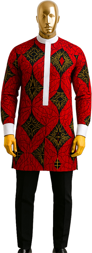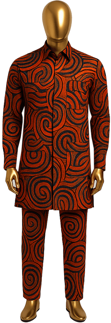 Bold burnt sienna and navy ankara print long-sleeved senator featuring mesmerizing swirling patterns. Dramatic curved motifs create hypnotic visual movement throughout the fabric. Contemporary fitted silhouette with coordinating ankara trousers for complete statement ensemble. Made from authentic African wax print fabric with rich saturated colors. The flowing organic patterns contrast beautifully with the structured senator cut. Warm terracotta tones paired with deep navy create sophisticated color combination. Contemporary styling makes bold traditional print highly wearable. Perfect for cultural celebrations, artistic events, fashion-forward gatherings, festive occasions, or confident African print styling with modern edge.