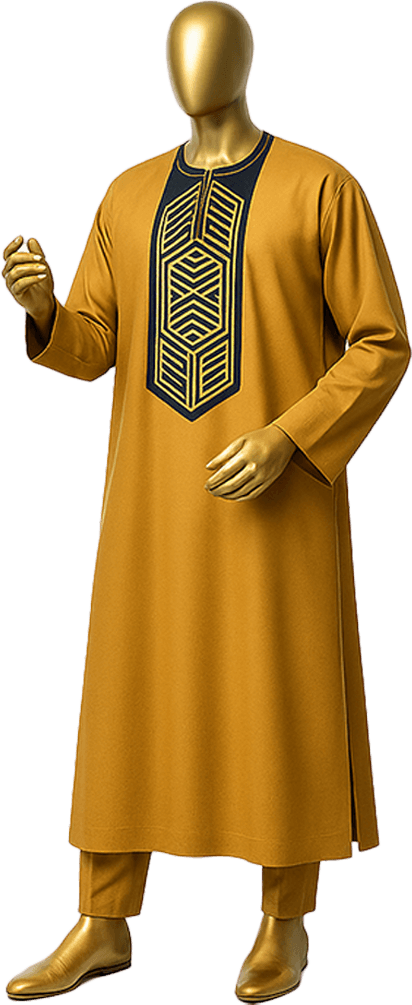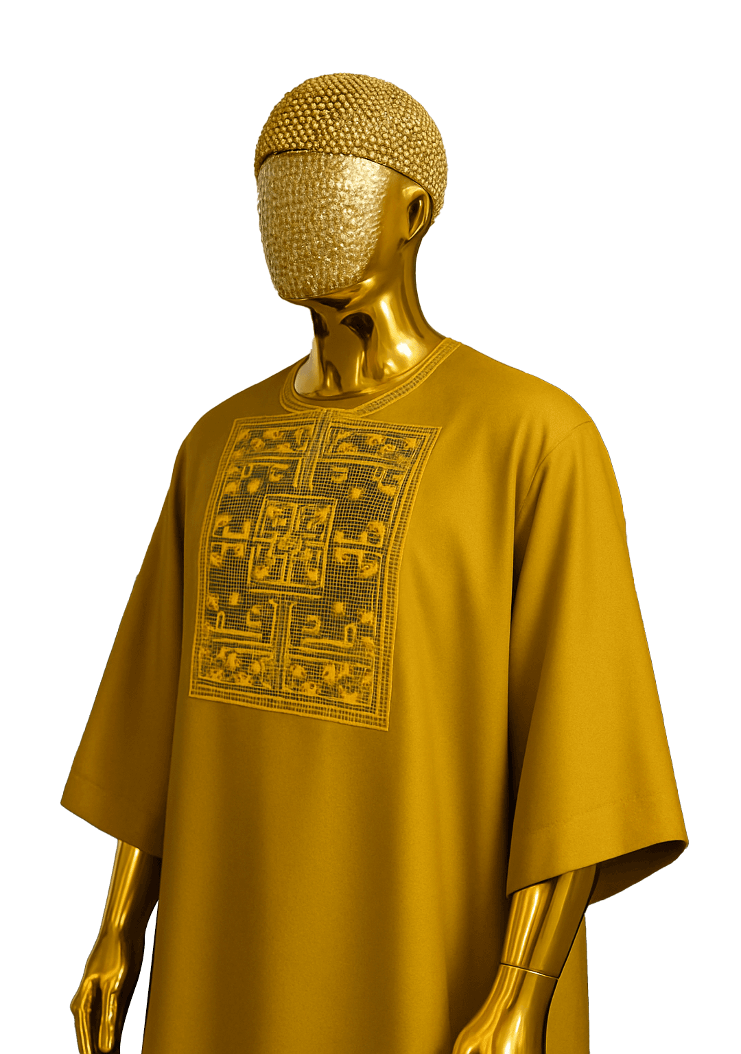 Embrace bold sophistication with this stunning golden mustard Agbada featuring intricate grid-pattern embroidery across the chest. The short-sleeved flowing design showcases traditional Northern Nigerian geometric motifs that create dimensional texture through expert needlework. The warm golden tone symbolizes wealth, wisdom, and the blessed sands of the Sahel region, making this piece particularly meaningful for celebrations of achievement and prosperity. This ensemble offers commanding presence at weddings, religious ceremonies, and cultural festivals. The breathable fabric ensures comfort during outdoor celebrations while the expert tailoring maintains structure and elegance. The grid embroidery pattern represents unity, organization, and the interconnectedness of community—core values in Nigerian culture. Style with matching trousers and brown or black leather accessories.
