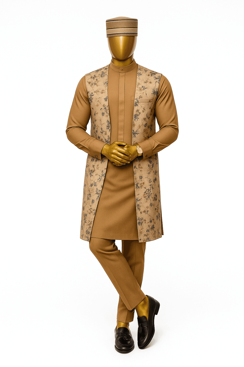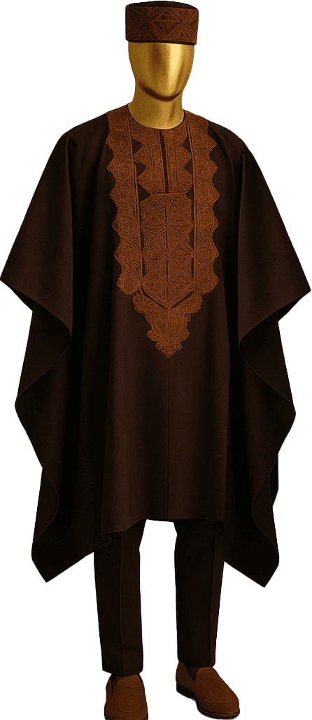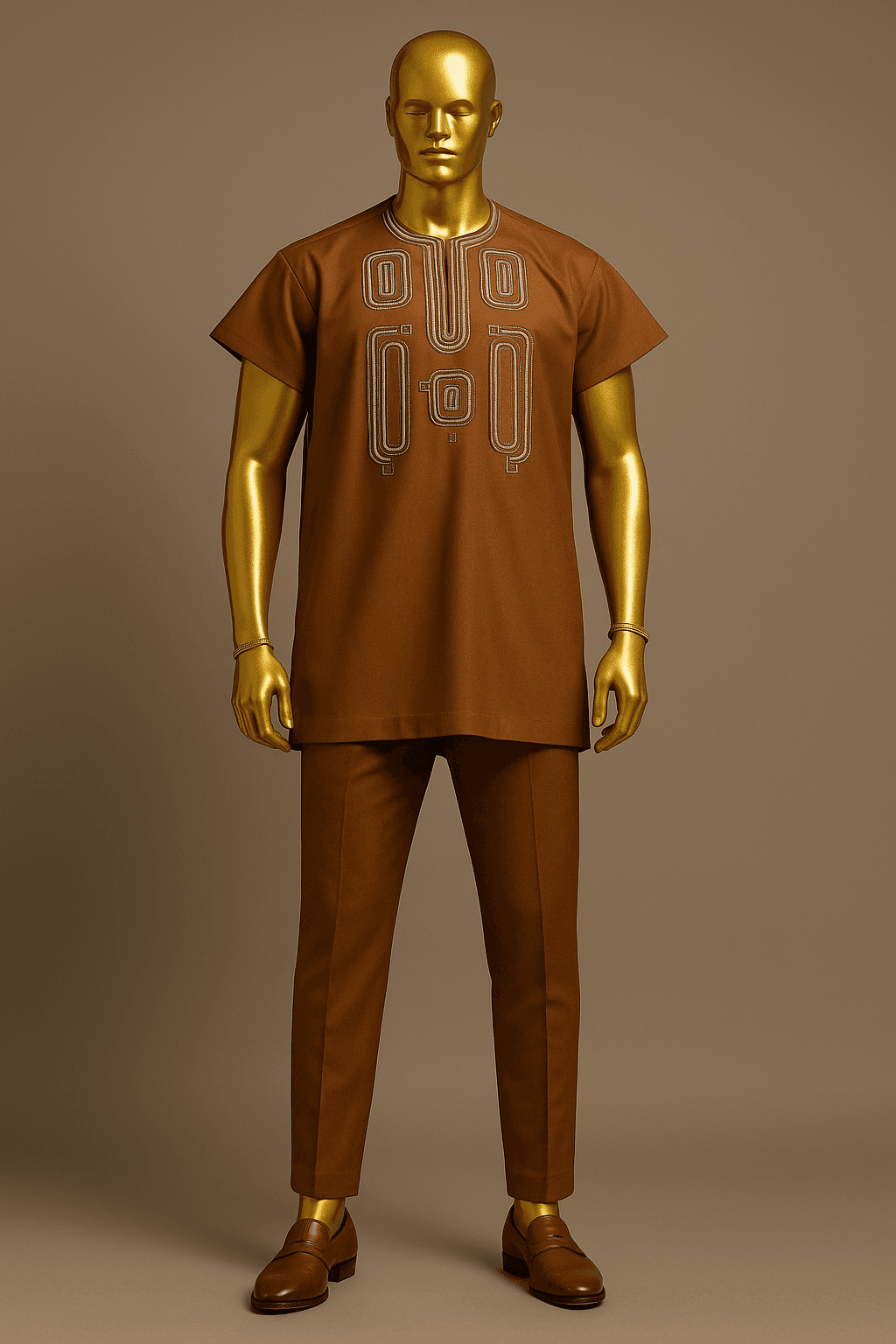 Embrace rich sophistication with this luxurious chocolate brown Agbada featuring stunning copper-toned embroidery. This elegant three-piece set combines deep earth tones with ornate detailing, perfect for the gentleman who appreciates warm colors and intricate artistry. This refined outfit showcases a short-sleeved Agbada in deep chocolate brown fabric, elevated by elaborate copper-colored embroidery featuring geometric and floral patterns arranged vertically on the chest. The warm copper threadwork creates beautiful contrast against the rich brown base. The traditional wide-sleeve design creates impressive flow. Complete with matching chocolate brown trousers and a coordinating brown Kufi cap, this three-piece ensemble delivers warm elegance for autumn weddings, traditional ceremonies, cultural festivals, and occasions requiring grounded sophistication. The chocolate brown evokes stability and timeless style. Custom-tailored to your exact measurements.