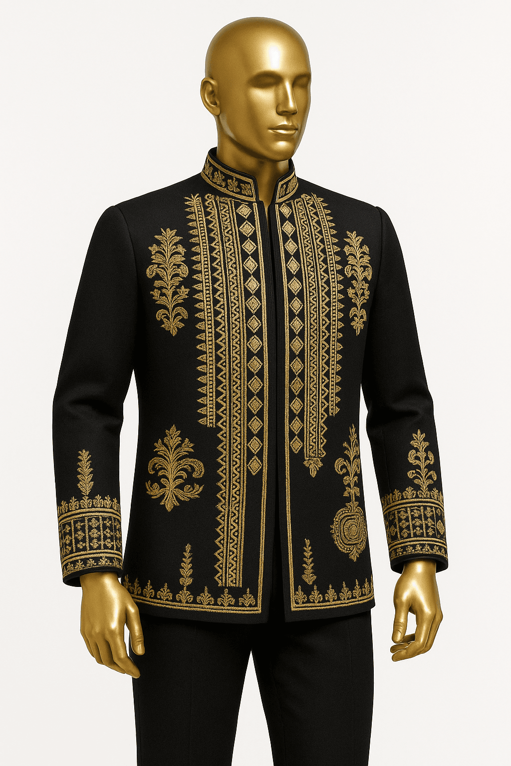 Command the room with this stunning black fitted jacket featuring elaborate golden embroidery that flows like liquid luxury across premium fabric. The intricate detailing showcases an array of traditional Nigerian motifs including geometric patterns, floral elements, and ornamental borders that frame the mandarin collar, front placket, sleeves, and hem. Each stitch tells a story of heritage and excellence, with the golden threads creating a magnificent contrast against the deep black canvas. This is the work of master craftsmen who understand that true luxury lies in the details—from the decorative buttons to the precisely embroidered cuff bands featuring pyramid and tribal patterns. Perfect for the distinguished gentleman who refuses to blend into the background, this jacket pairs beautifully with tailored black trousers for a complete sophisticated look. Whether you're attending a high-profile gala, cultural celebration, milestone birthday, or prestigious business event, this piece ensures you'll be remembered. The structured fit offers modern tailoring while the traditional embellishments honor ancestral artistry. This is investment dressing at its finest—a statement piece that transcends trends and becomes a cherished part of your wardrobe legacy.