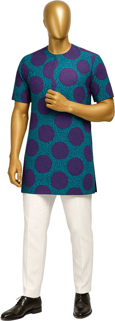 Vibrant teal and purple ankara print short-sleeved senator with bold circular motifs. Large medallion patterns in deep purple create striking contrast against the rich teal background. Relaxed contemporary fit offers comfortable modern styling. Paired with crisp white trousers for fresh color-blocked appeal. Made from authentic African wax print fabric with saturated jewel tones. The oversized circular pattern creates dramatic visual impact and festival energy. Contemporary senator silhouette gives traditional print modern versatile wearability. Perfect for cultural events, festive celebrations, artistic gatherings, fashion-forward occasions, or showcasing vibrant African textile heritage with contemporary flair.