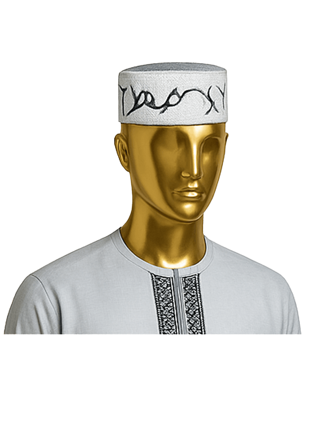 Complete your traditional ensemble with this pristine white Kufi cap featuring bold abstract embroidery detailing. This contemporary accessory brings modern artistic flair to classic Nigerian headwear, perfect for the gentleman who appreciates clean aesthetics with distinctive character. This beautifully crafted cap showcases crisp white fabric with striking black abstract line embroidery running around the band, creating an artistic, free-flowing pattern that adds visual interest without overwhelming. The traditional Kufi construction maintains its structured cylindrical shape while providing comfortable wear throughout the day. The minimalist white base with contrasting black threadwork offers versatile styling options that complement virtually any traditional outfit, from vibrant Ankara to sophisticated solid tones. Ideal for religious ceremonies, weddings, cultural celebrations, and formal gatherings. One size fits most with custom sizing available upon request.