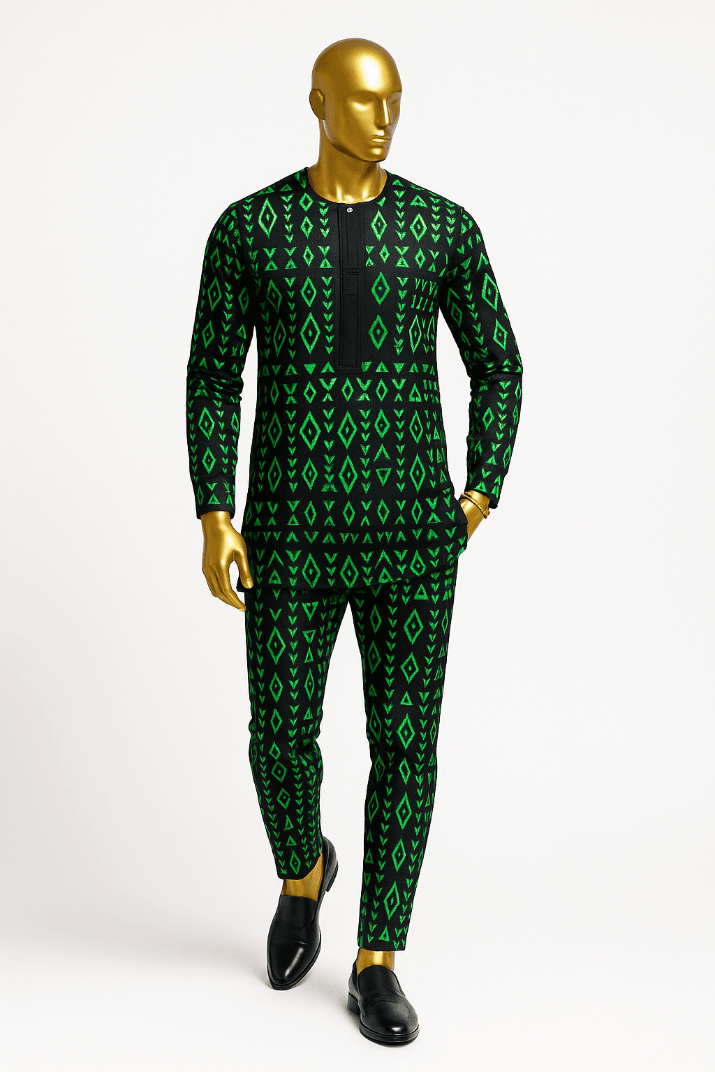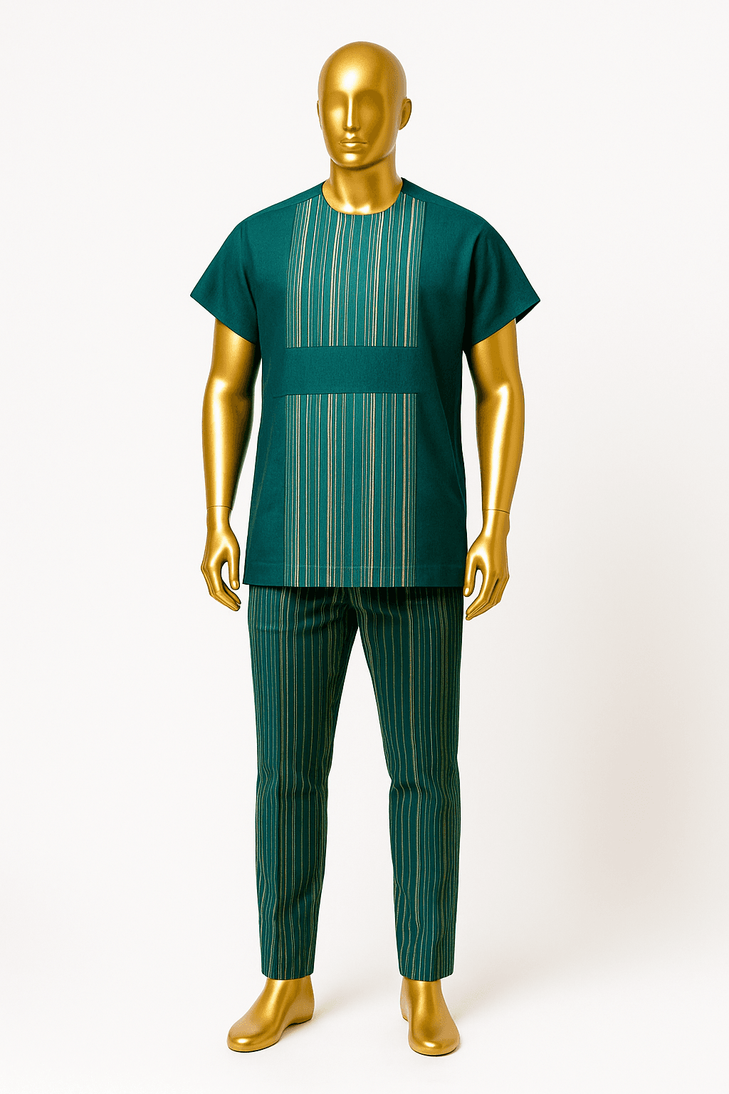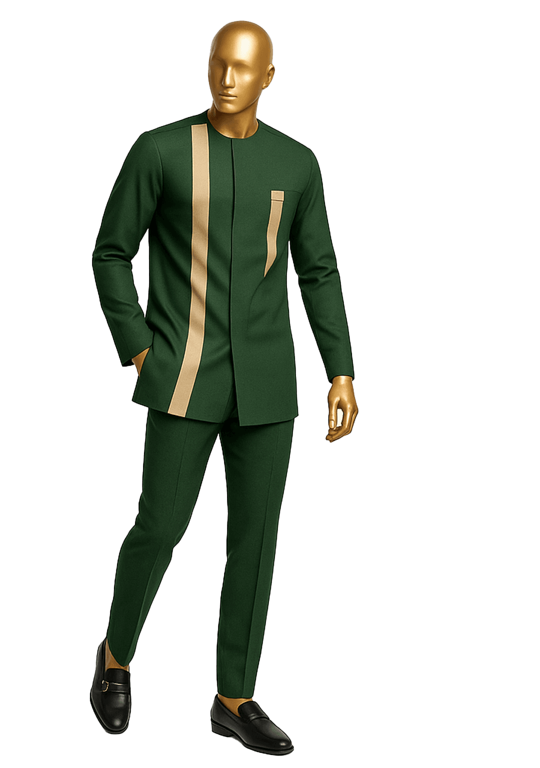 Step into contemporary elegance with this striking forest green Senator suit featuring sophisticated gold contrast panels. This modern two-piece set bridges traditional Nigerian styling with fashion-forward design, perfect for the gentleman who appreciates bold color combinations and distinctive details. This sharp ensemble showcases a long-sleeved Senator top in rich forest green fabric, elevated by eye-catching gold vertical panels running down the front on both sides of the placket. The contrasting gold trim creates a sleek, elongating effect while adding luxurious visual interest. A matching gold chest pocket detail completes the refined aesthetic. The round neckline and structured fit offer contemporary tailoring that flatters the physique. Paired with matching forest green straight-leg trousers, this two-piece suit delivers sophisticated style for weddings, cultural celebrations, upscale social events, fashion-forward gatherings, and occasions where you want to make a memorable impression. The rich green symbolizes growth and prosperity while the gold accents add a touch of opulence. Custom-tailored to your exact measurements for impeccable fit.