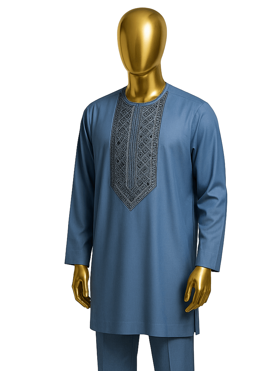 Discover sophisticated versatility with this elegant steel blue Kaftan ensemble featuring intricate geometric embroidery. This refined two-piece set combines calming blue tones with detailed craftsmanship, perfect for the modern gentleman who appreciates understated elegance and cultural refinement. This outfit showcases a long-sleeved Kaftan top in beautiful steel blue fabric, adorned with an elaborate embroidered chest panel in contrasting navy thread. The intricate geometric diamond and lattice patterns create visual depth and traditional authenticity. The round neckline and knee-length cut maintain classic proportions while the contemporary color palette offers modern appeal. Paired with matching straight-leg trousers in the same sophisticated blue tone, this two-piece ensemble delivers polished style for religious services, corporate cultural events, casual weddings, weekend celebrations, and formal gatherings. Custom-tailored to your exact measurements for perfect fit and comfort.
